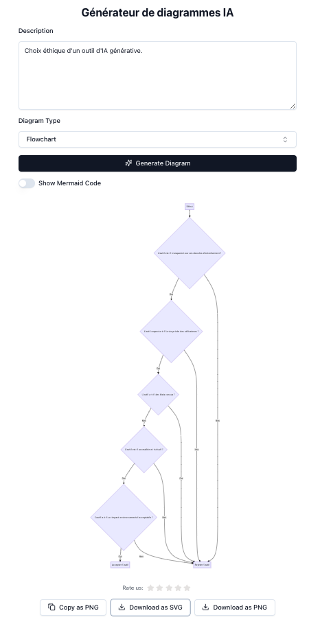 Diagram generator (https://diagram-generator.com) génère des visualisations à partir d’une instruction depuis 9 modèles disponibles : organigramme, Gantt, mindmap, etc. avec...