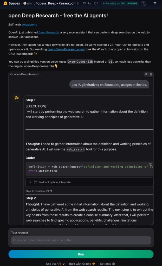 Open Deep Research (description : https://huggingface.co/blog/open-deep-research et espace démo : https://huggingface.co/spaces/m-ric/open_Deep-Research ) est l’agent de recherche « avec raisonnement » développé par...