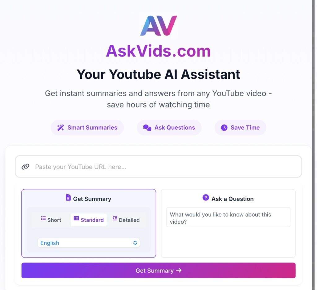 Askvids (https://www.askvids.com) résume des vidéos YouTube en trois formats ou via une instruction. 17 langues disponibles. Partage possible par URL....