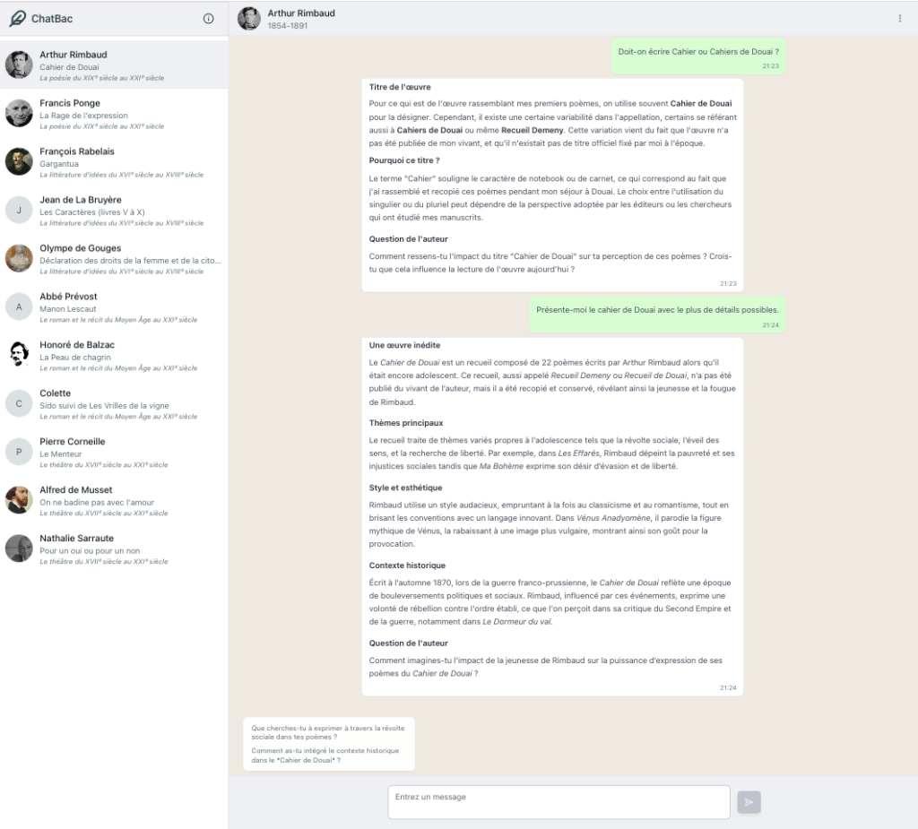 Chatbac (https://chatbac.fr) propose de converser avec des autrices et auteurs au programme du baccalauréat de français : Rimbaud, Ponge, Rabelais,...