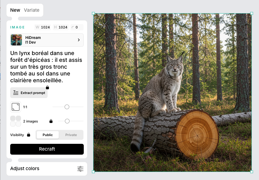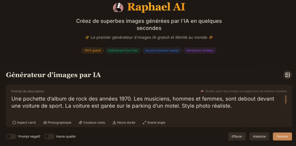 Raphael (https://raphael.app/fr) génère des images en se basant sur le modèle Flux-1 Dev. Plusieurs options de tailles, styles, de lumières,...