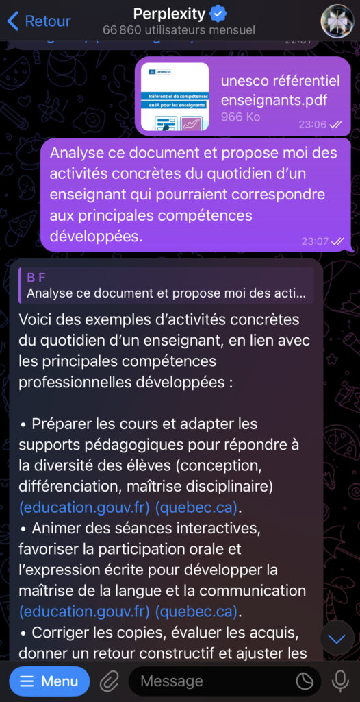 Plexbot (t.me/askplexbot) est le chatbot Telegram de Perplexity Les documents sont acceptés et un mode « pro » est activable via la...