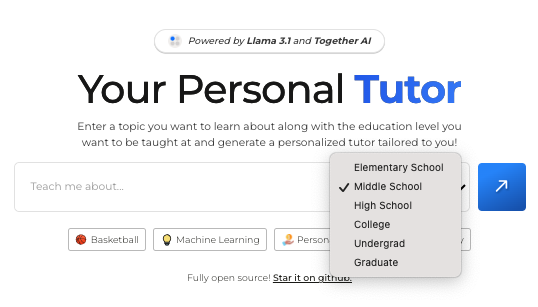 Llama Tutor (https://llamatutor.together.ai/ et documentation : https://github.com/Nutlope/llamatutor) est un chatbot basé sur Llama 3.1 configuré pour accompagner les apprentissages en...