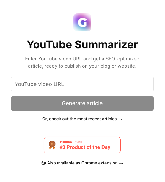 Youtube article summarizer (https://gist.ly/youtube-summarizer) génère un article type blog, long et structuré, à partir d’une vidéo Youtube.Export par copier /...