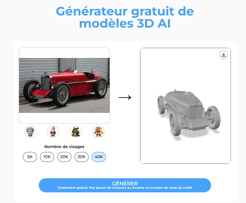 IMGto3D (https://www.imgto3d.ai/fr) génère des objets 3D à partir d’une image au format png ou jpg jusqu’à 1Mo. Génération en 30s...