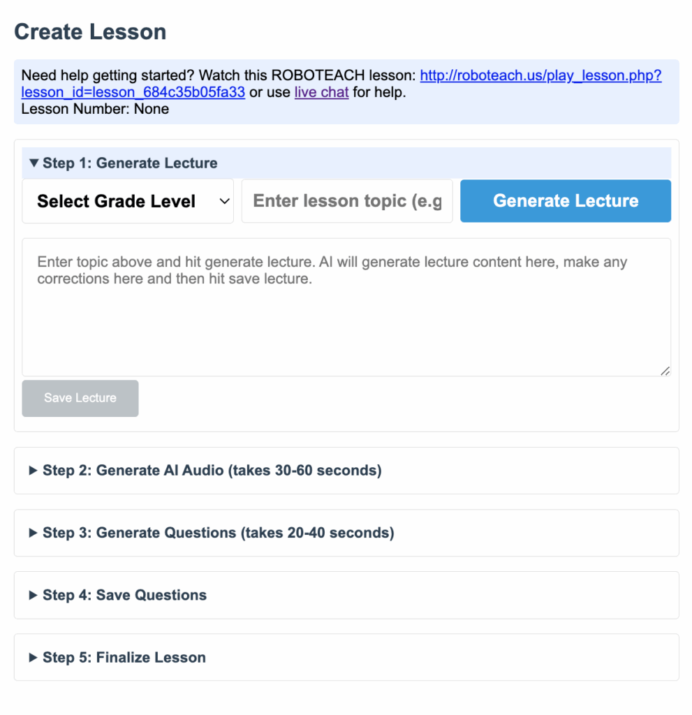RoboTeach (https://roboteach.us) génère un cours à partir d’un sujet donné. Le cours est proposé avec possibilité d’édition, son enregistrement audio...