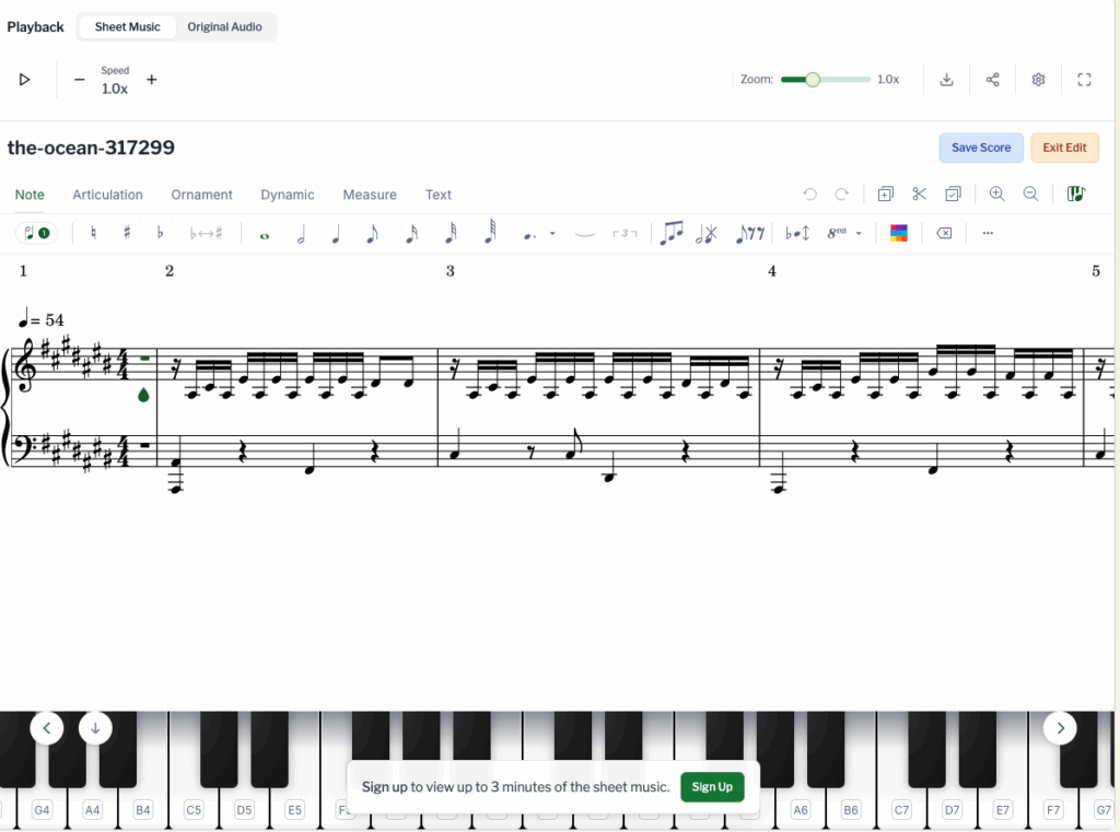 Songscription (https://songscription.ai) génère la partition transcrite d’un morceau de musique depuis un morceau chargé (formats mp3, wav, mp4, m4a, midi)...