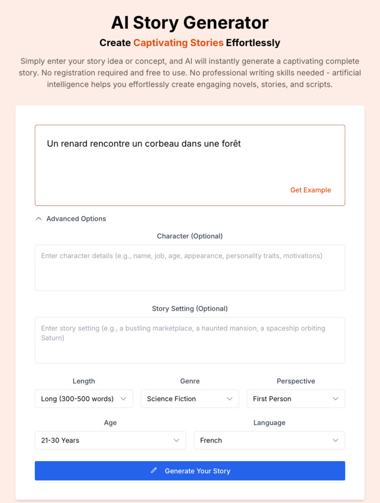 Ai story generator (https://www.aistorygenerator.shop) génère des histoires à partir d’une instruction. Dans les options avancées, les personnages et l’histoire peuvent...