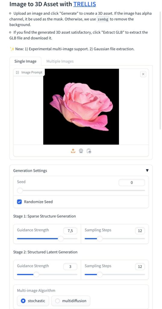 Trellis (https://huggingface.co/spaces/JeffreyXiang/TRELLIS…) génère un modèle #3D à partir d’une ou plusieurs images. Fond effacé automatiquement et réglages fins disponibles. Export...