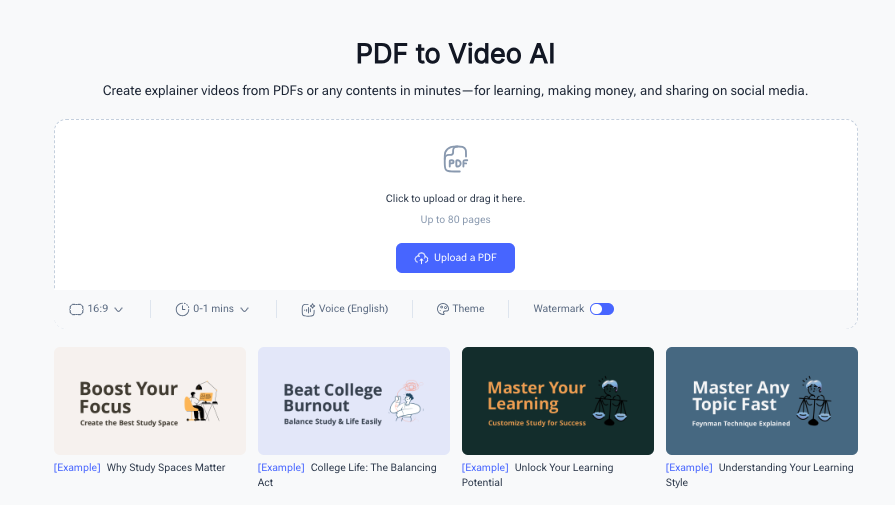 Pdf to video (https://pdftovideo.ai/) génère une vidéo avec voix à partir d’un pdf jusqu’à 80 pages. Voix en 24 langues...
