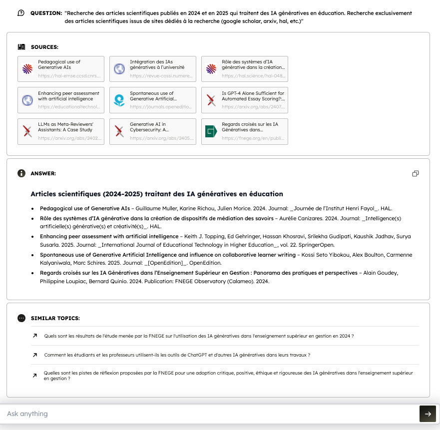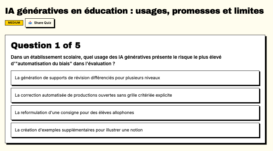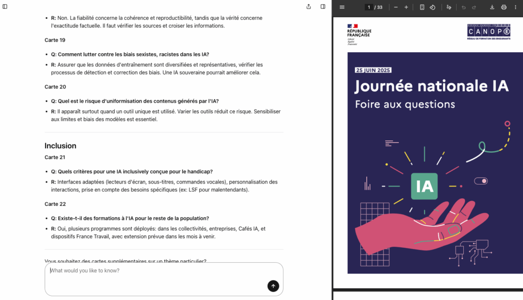 Feyn (https://feyn.ai) propose d’explorer un sujet par étapes : chaque génération se termine par un quiz (FR ok mais peut...