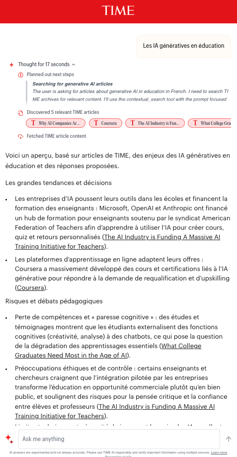Time AI (https://time.com/timeai/) est l’agent conversationnel avec raisonnement du magazine Time basé sur l’es contenus d’ensemble de ses contenus et...