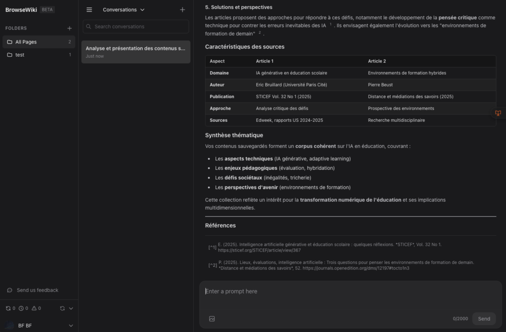 Browsewiki (https://browsewiki.com/) permet la sauvegarde de pages web puis la conversation avec ces mêmes pages via un chatbot. Une extension...