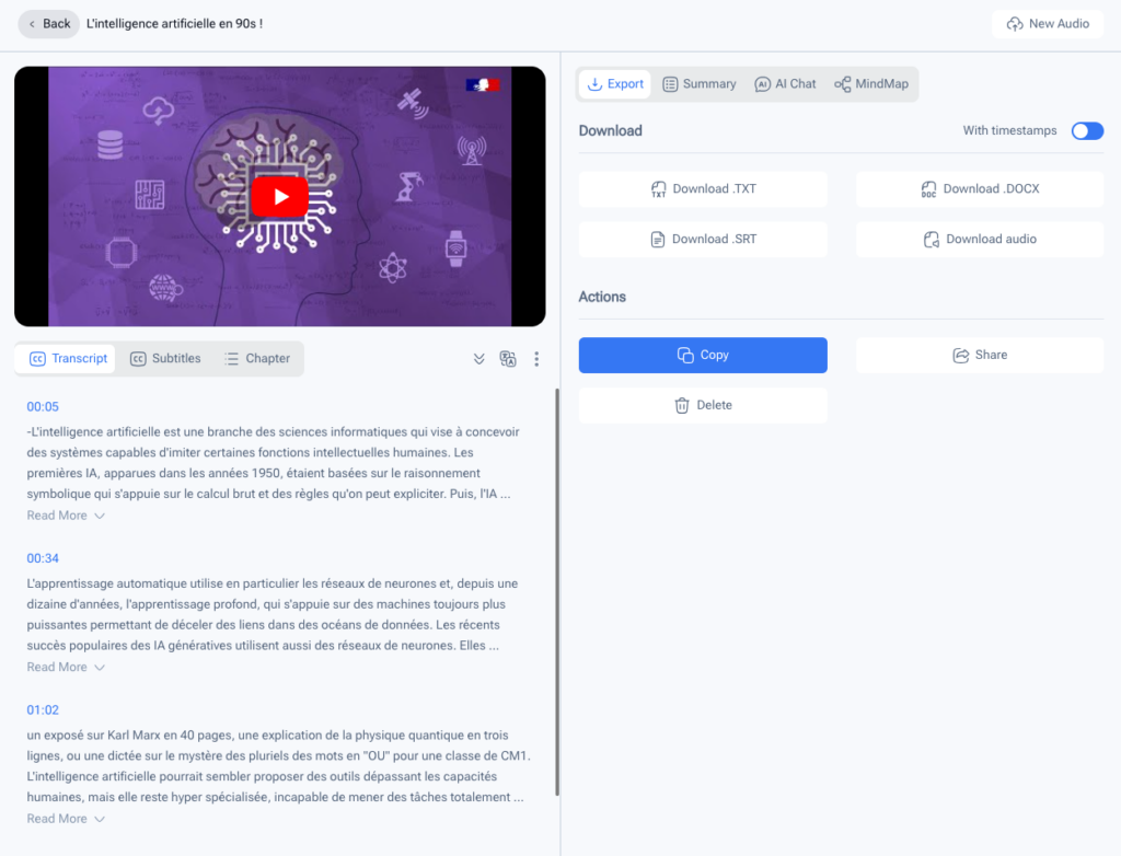 Audio Converter (https://audioconverter.ai/) transcrit de l’audio issu d’un fichier, d’une vidéo youtube ou d’une url puis en propose l’export, un...