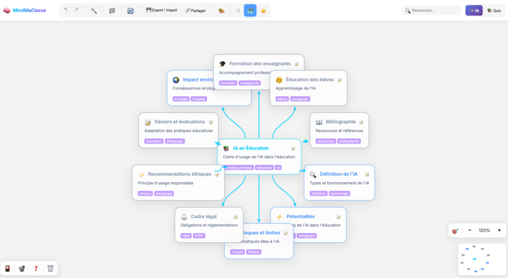 Mindmaclasse (https://apps4edu.fr/mindmaclasse/) génère des cartes mentales à partir d’une instruction ou d’un document ainsi que des exercices pour réviser (quiz,...