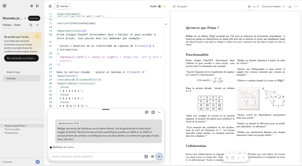 Prism (présentation : https://openai.com/fr-FR/prism/ et application : https://prism.openai.com/) d’OpenAI est un éditeur LaTex couplé à un chatbot basé sur ChatGPT...