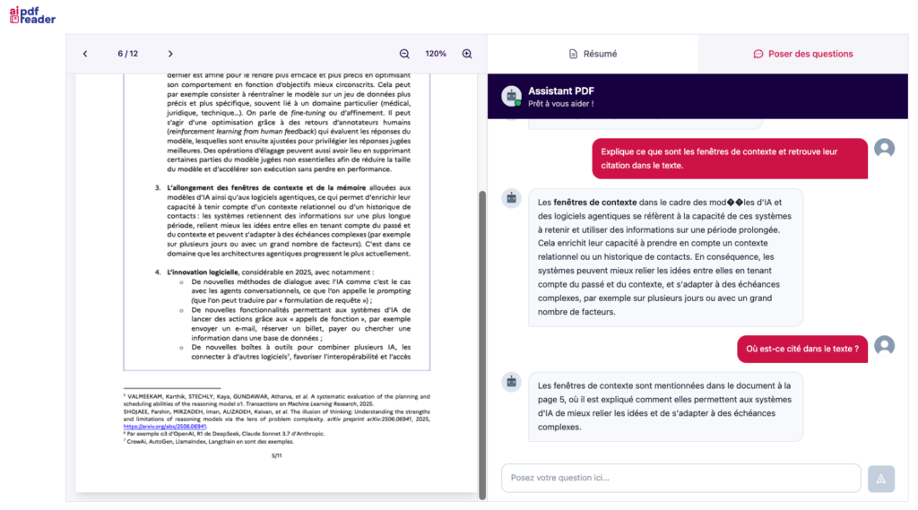 Ai pdf reader (https://aipdfreader.net/fr) résume des documents pdf et permet de les interroger via un chatbot. Pas de limitation repérée...