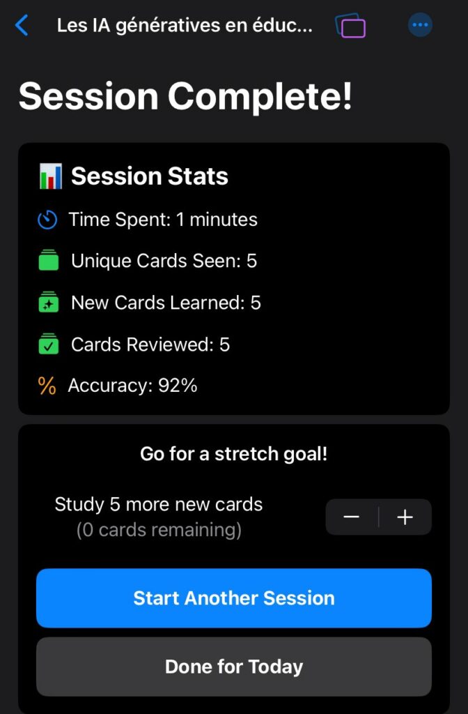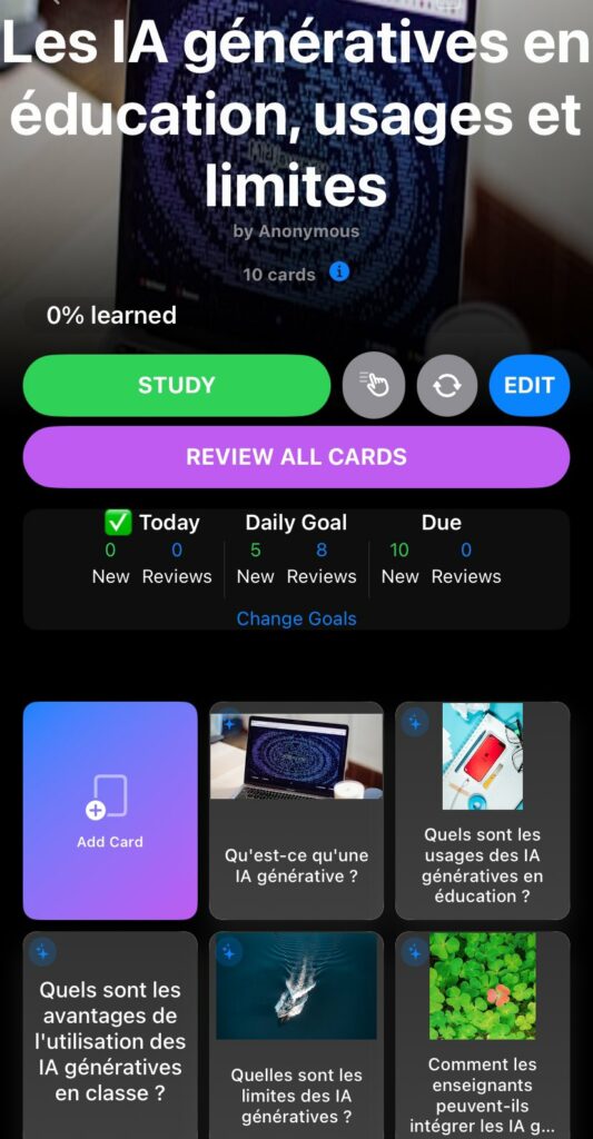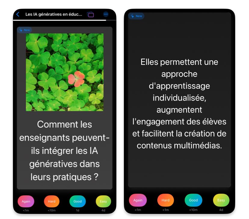 Cerebella (https://cerebellaapp.com) génère des flashcards que des sujets éducatifs avec répétition, suivi des apprentissages programmé sur la durée via des notifications et analyse des résultats. Sur iOS, avec ou sans compte, version beta gratuite.