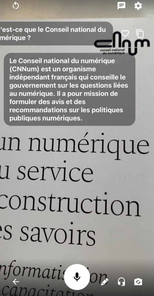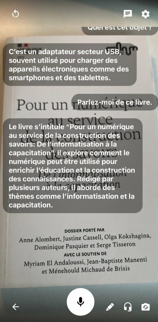 Chat Camera (https://talkycamera.com/chat-camera) permet l’analyse et la conversation audio ou texte en temps réel via la caméra (smartphone ou tablette) et chatGPT 4o. Source : @cnnum : https://cnnumerique.fr/nos-travaux/pour-un-numerique-au-service-des-savoirs… Gratuit et sans compte, pour iOS et Android.