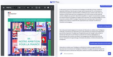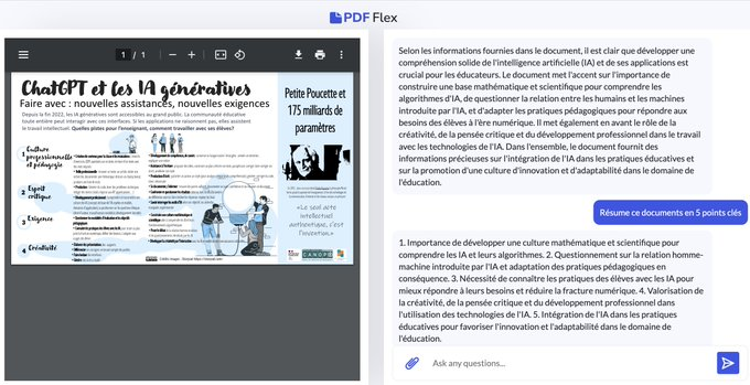 Chat with pdf (https://pdfflex.com/ai-chat-with-pdf…) permet de questionner des documents pdf jusqu’à 10 Mo, sans compte, gratuitement, en illimité et sans conservation des documents. N’analyse pas les images des documents. En anglais, accepte le français si spécifié.