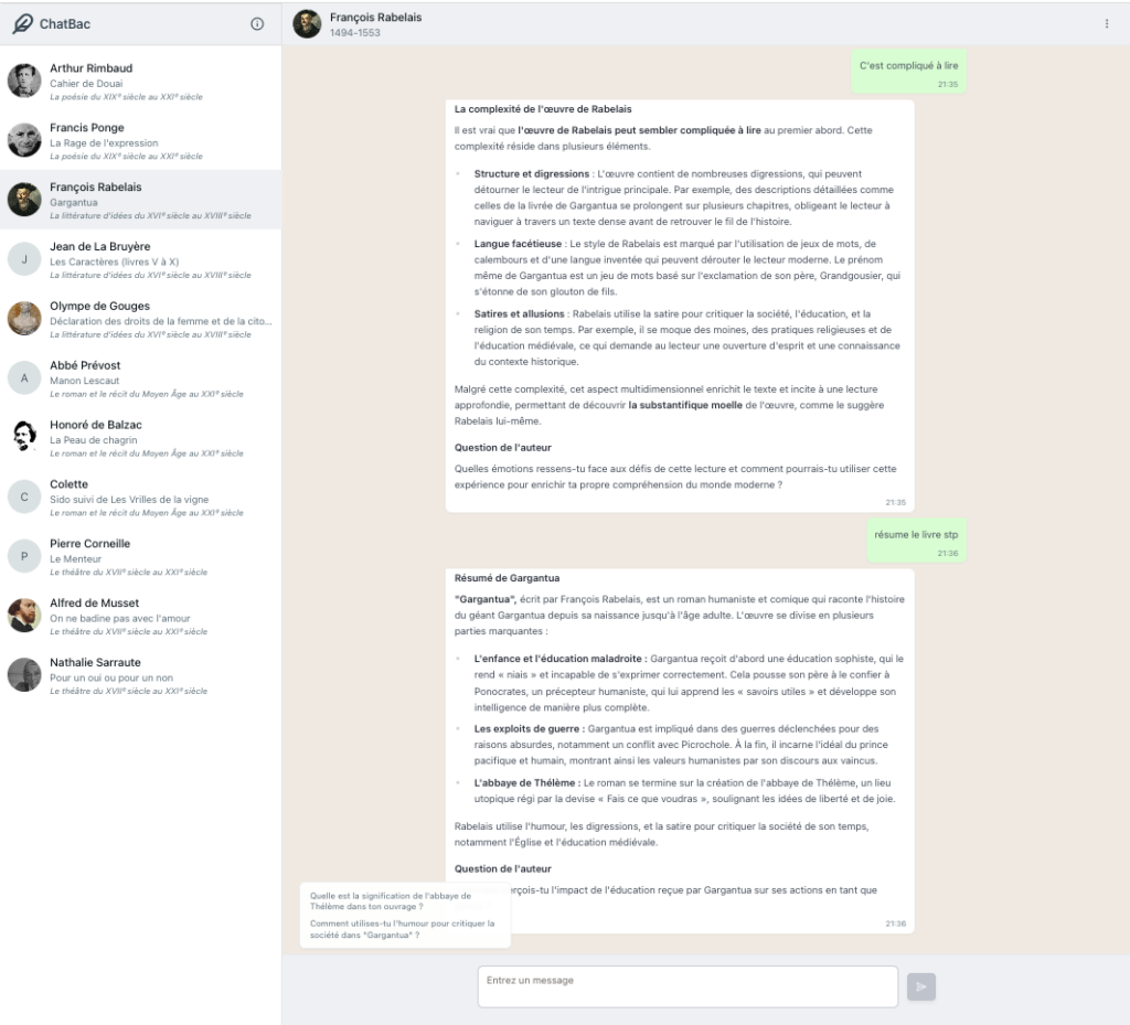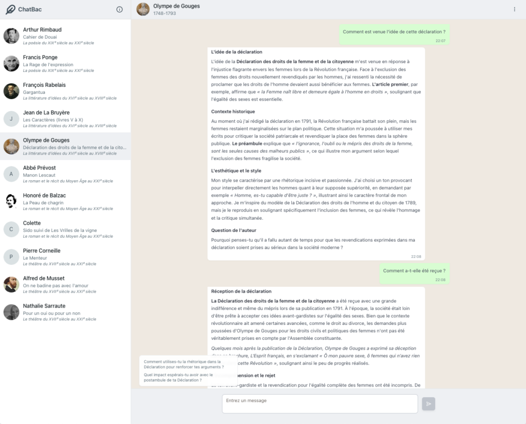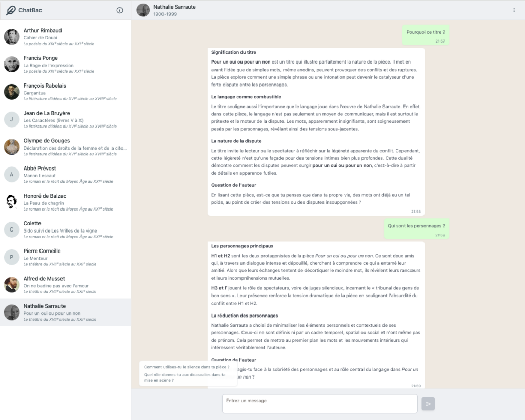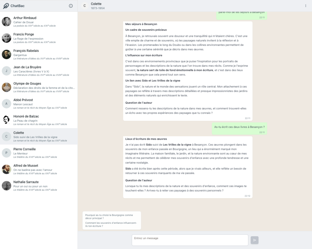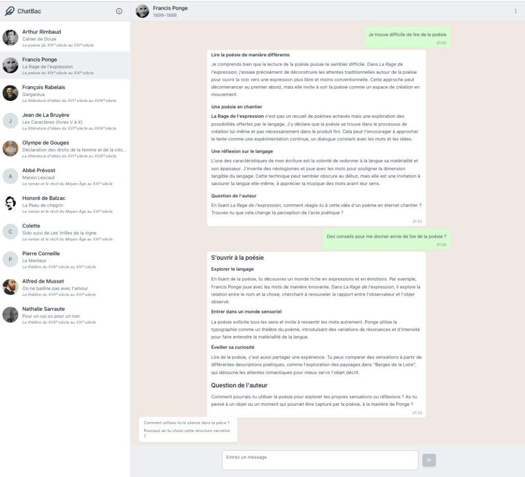 Chatbac (https://chatbac.fr) propose de converser avec des autrices et auteurs au programme du baccalauréat de français : Rimbaud, Ponge, Rabelais, La Bruyère, O. de Gouge, Abbé Prévost, Balzac, Colette, Corneille, Musset et N. Sarraute.