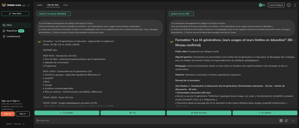 Chatbot Arena (précédemment LLMSys déjà présenté) bénéficie d’une nouvelle interface avec 3 entrées (https://chatbot-arena.web.app) : battle découverte à l’aveugle de 2 LLM de son classement, side by side comparaison choisie et chat un seul interrogé. Sans compte, gratuit et illimité.