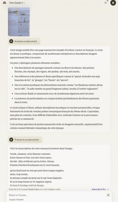Claude 3 (https://claude.ai) : nouvelle version par @AnthropicAI avec 3 nouveaux LLM dont « Sonnet », modèle intermédiaire, est gratuit. La lecture d’images et de documents (5 max de 10 mo) est désormais possible. Sources pour les tests :