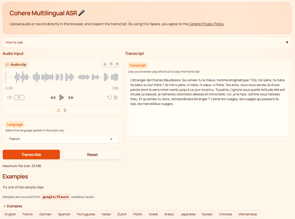 Cohere transcribe (documentation : https://huggingface.co/CohereLabs/cohere-transcribe-03-2026 et démonstration : https://huggingface.co/spaces/CohereLabs/cohere-transcribe-03-2026) retranscrit des audios enregistrés ou importés.