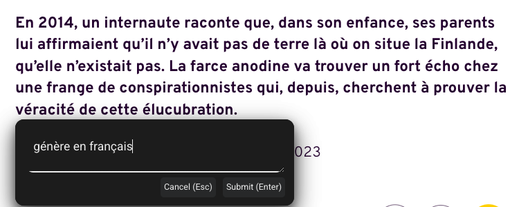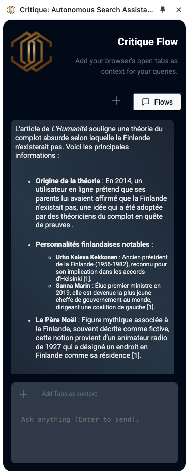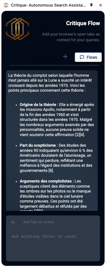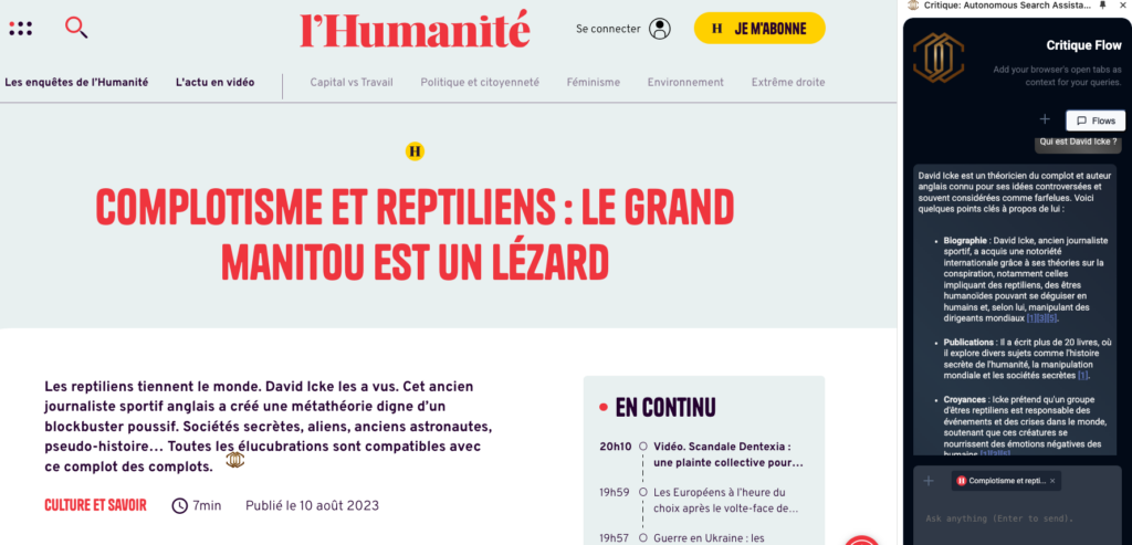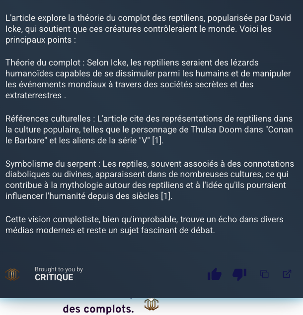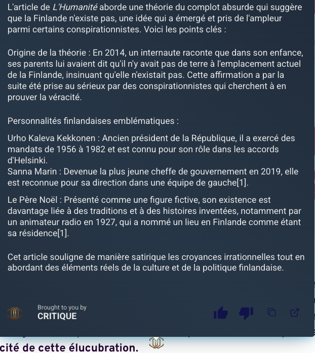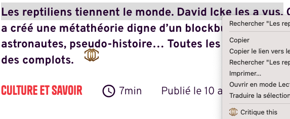 Critique (https://critiquebrowser.app/) est une extension Chrome qui permet de vérifier les informations présentes sur des sites ou réseaux sociaux. Accessible depuis le bouton droit et/ou intégrée au navigateur via un chatbot. Préciser « Génère en français ».