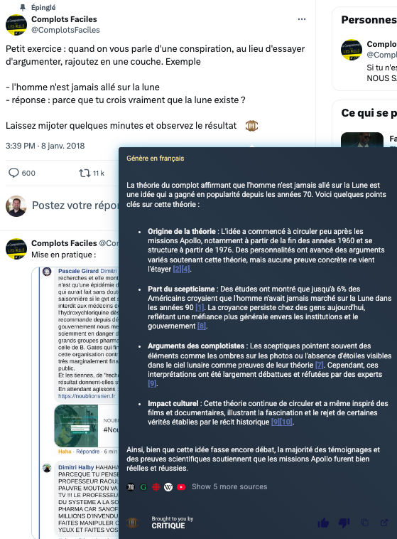 Sources pour les tests : https://www.humanite.fr/mot-cle/les-theories-du-complot-les-plus-farfelues et tweet https://x.com/ComplotsFaciles/status/950376531846627328