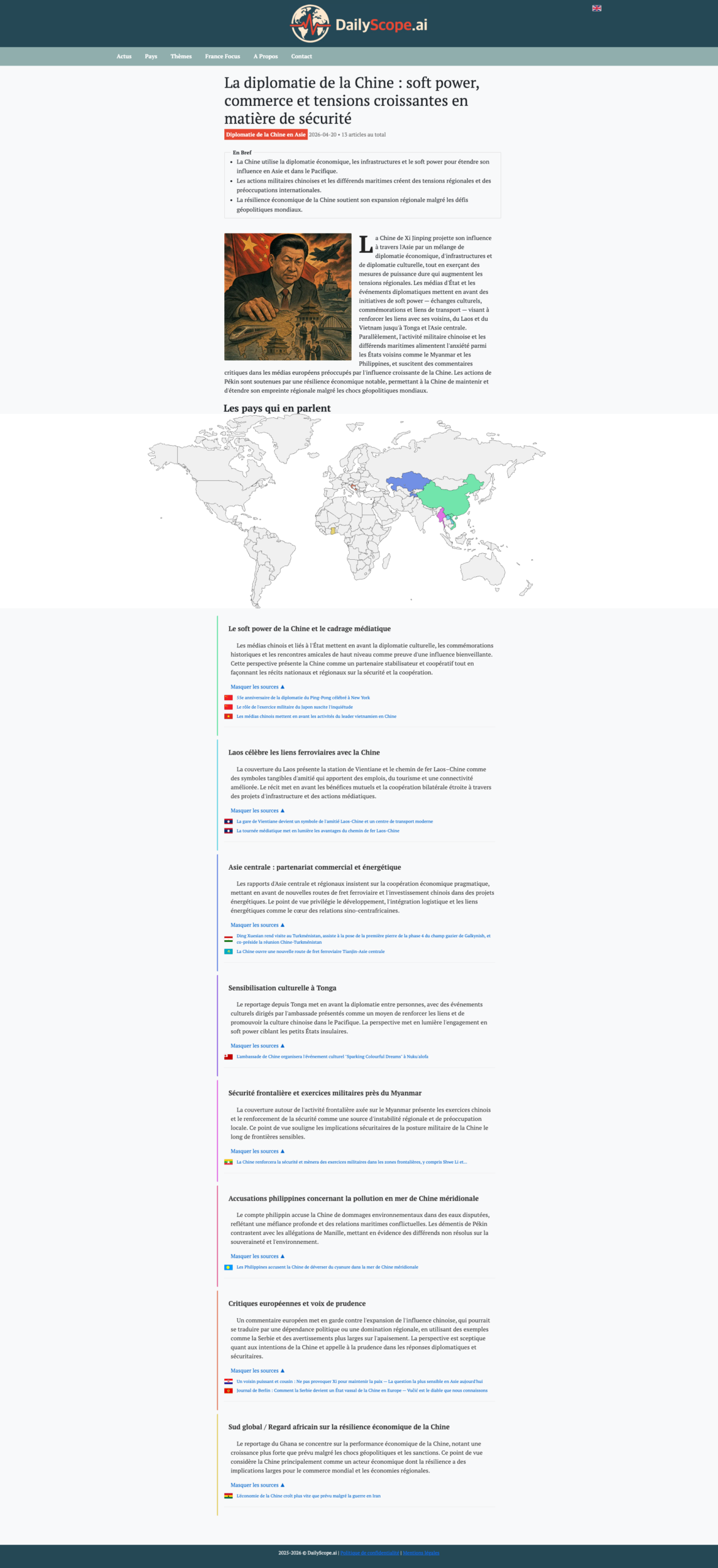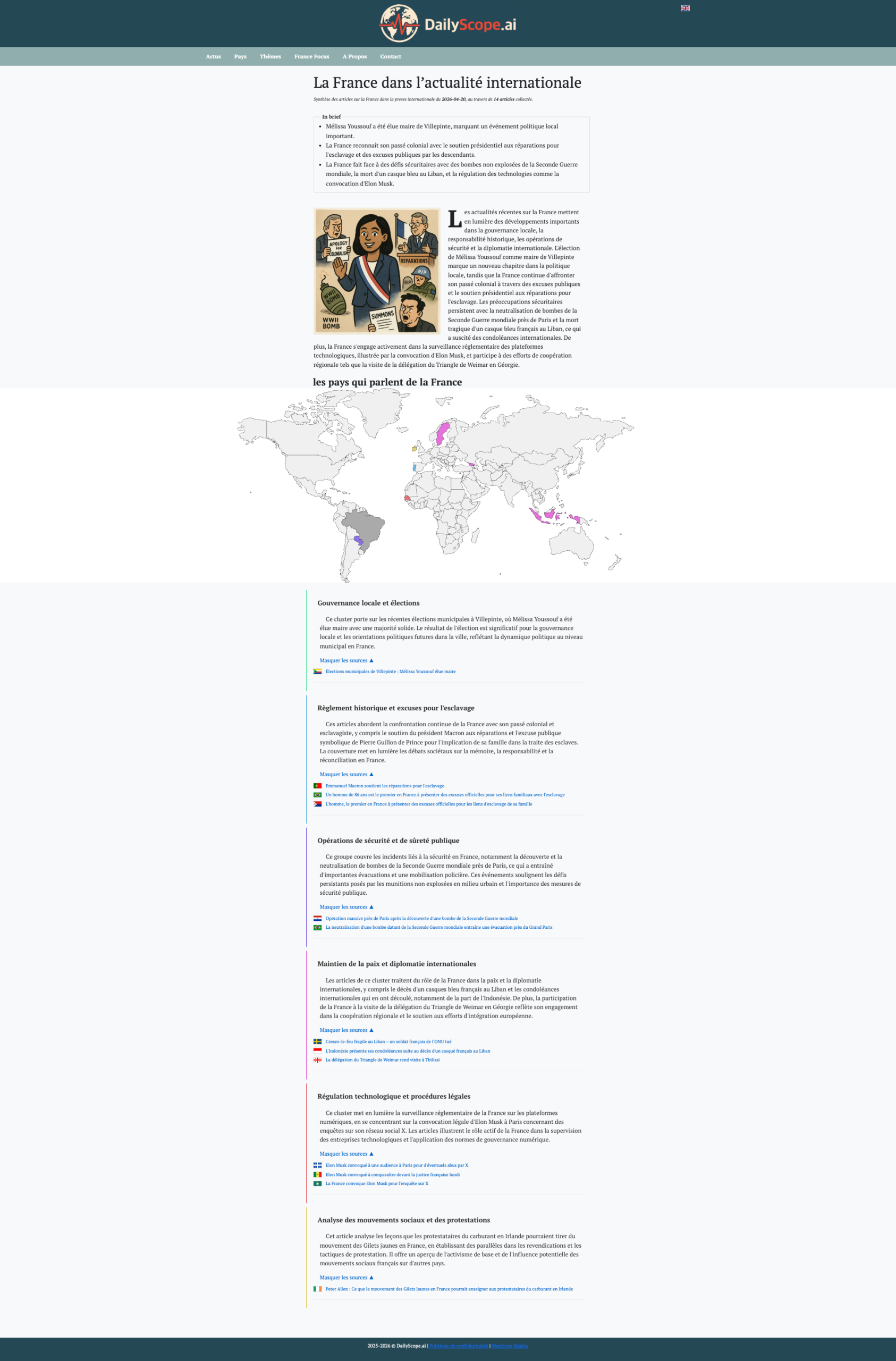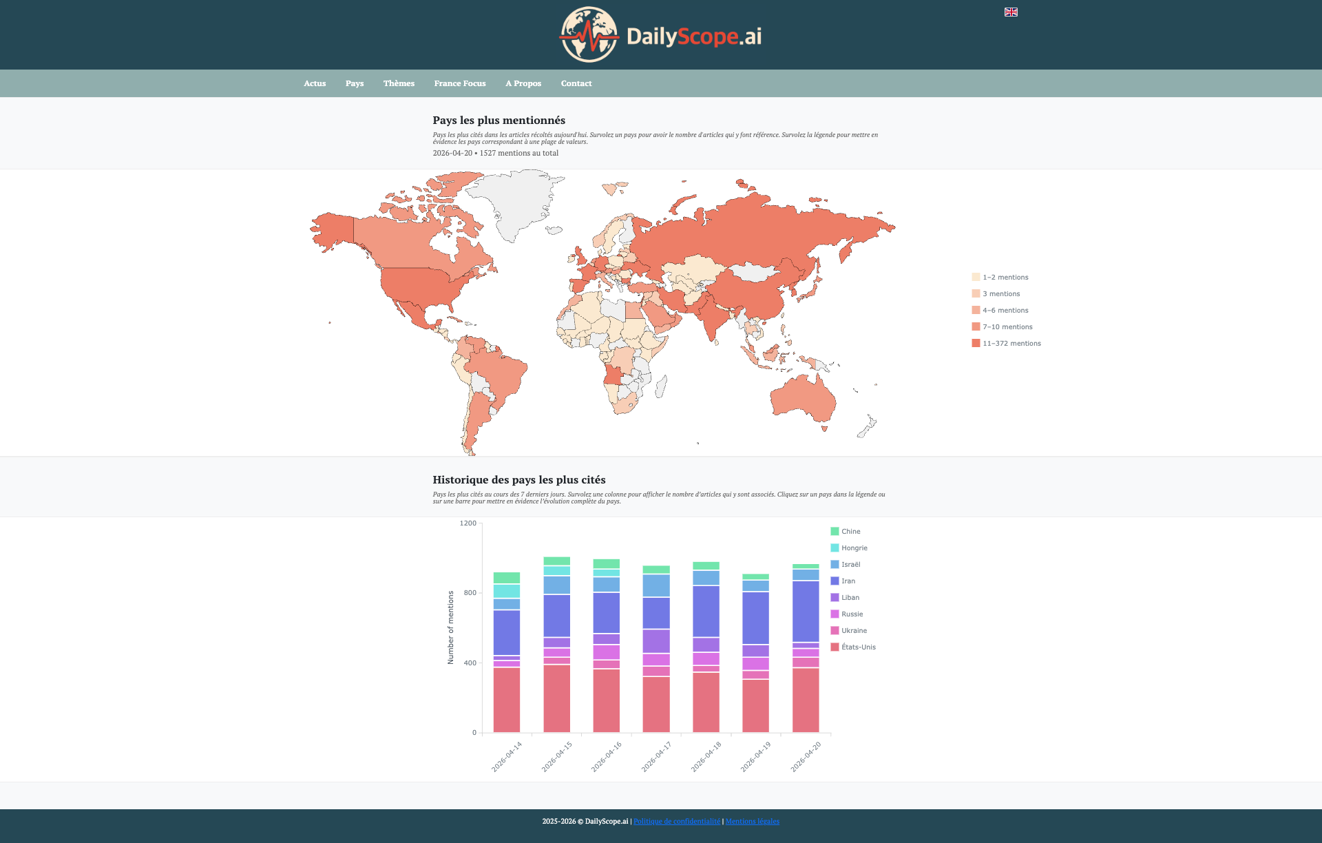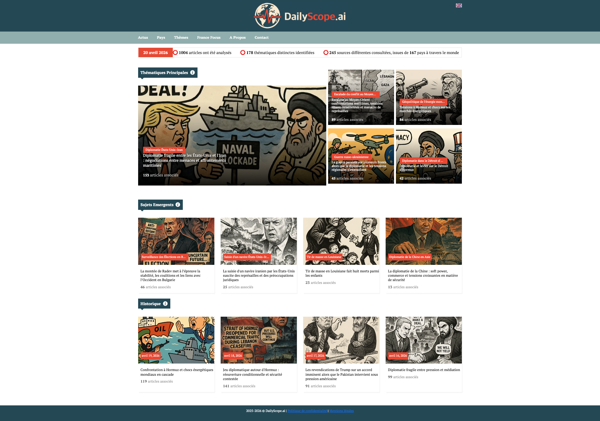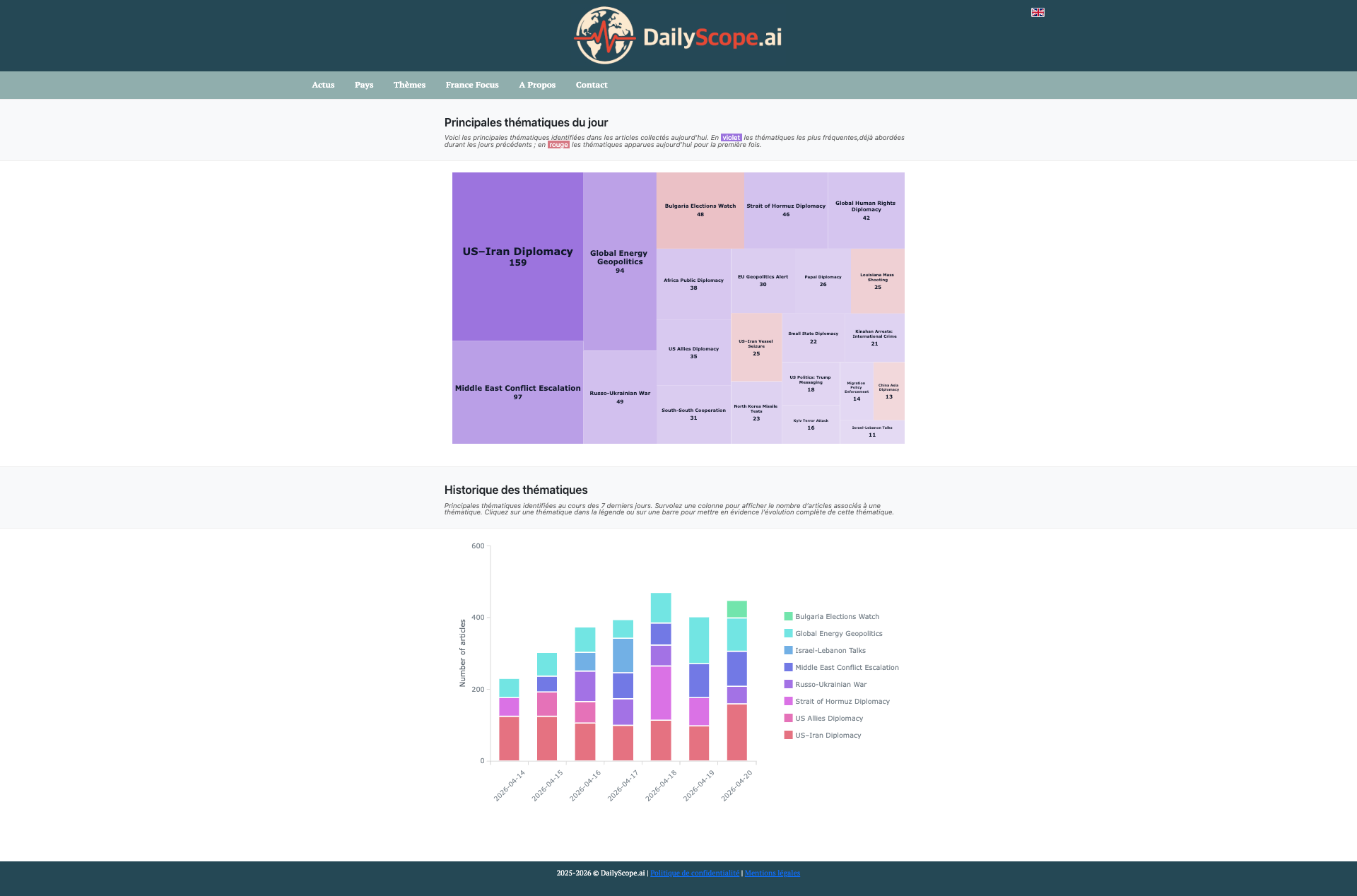 Dailyscope (https://www.dailyscope.ai) analyse chaque jour des sources de presse internationale (pas de sources françaises) pour en faire émerger les thèmes principaux et permettre la comparaison entre les différents traitements d’un même sujet.
