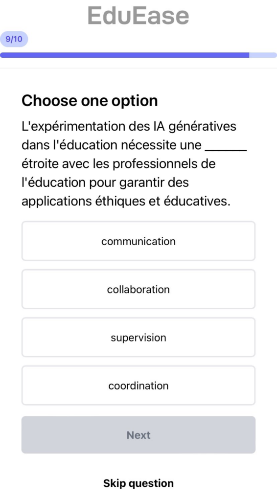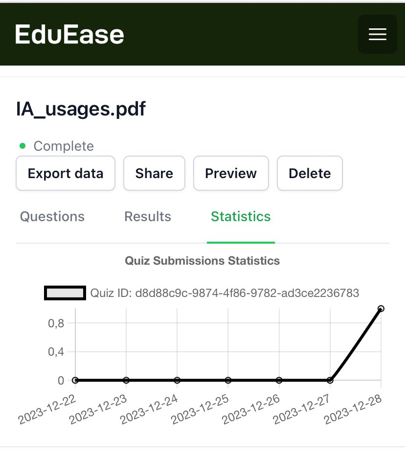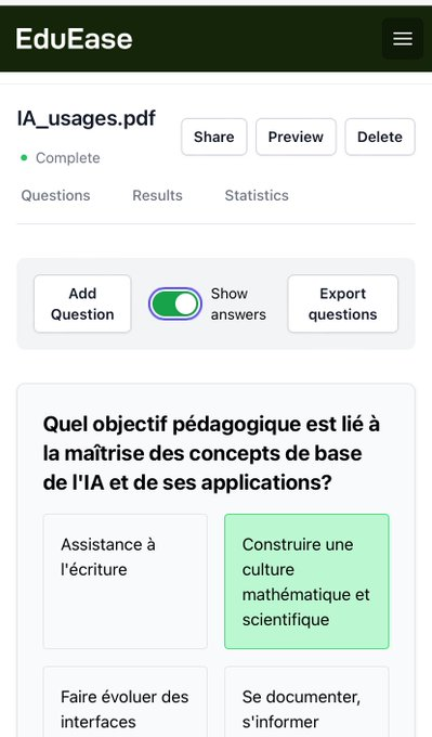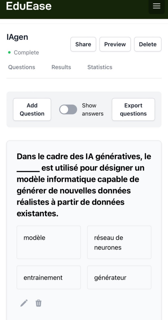 Eduease (https://learn.eduease.ai/) génère un quiz à partir d’un sujet ou d’un fichier pdf, choix multiples ou vrai/faux en 4 difficultés. Questions éditables, ajouts et export possibles, envoi et suivi des réponses (compte pour répondre). Gratuit et illimité.