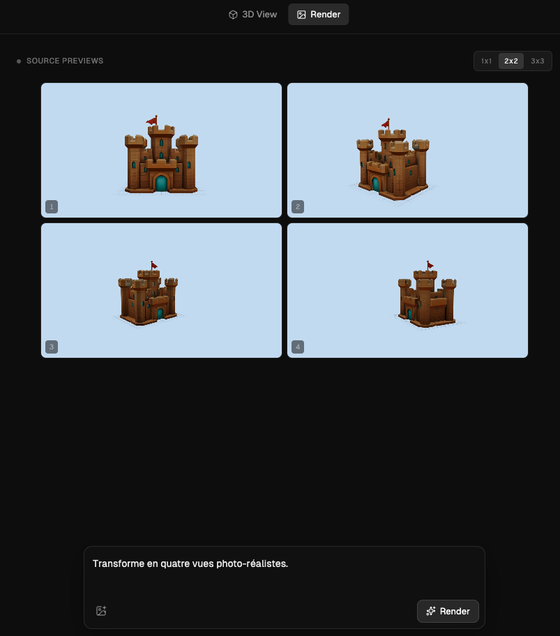 Pour les fichiers skp et glb, après chargement, l’utilisateur choisit entre 2 et 9 vues et ajoute une instruction pour générer les images.