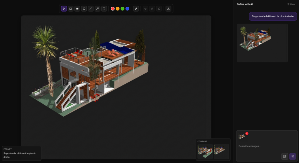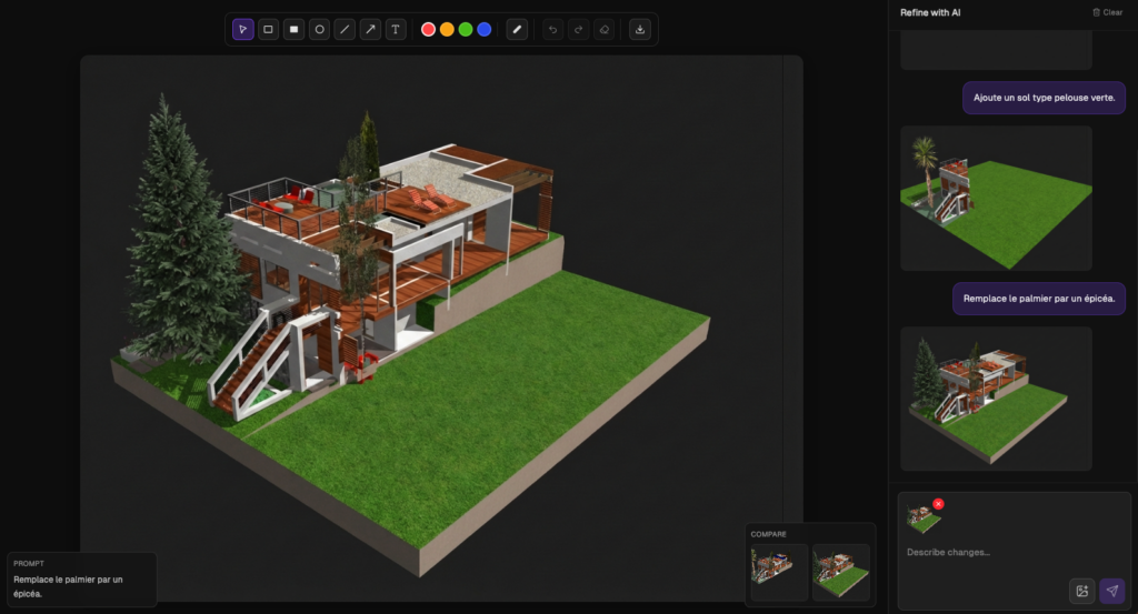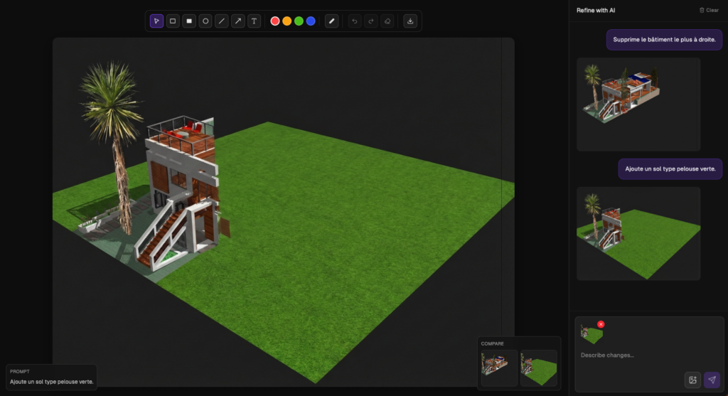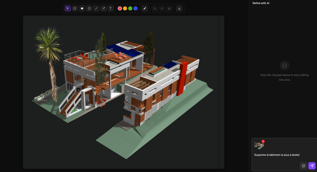 Trois modes sont proposés : de puis un fichier sjetchup (skp), un fichier 3D (glb) ou l’édition d’images de type rendu 3D à partir d’une interface de dessin et un chatbot.