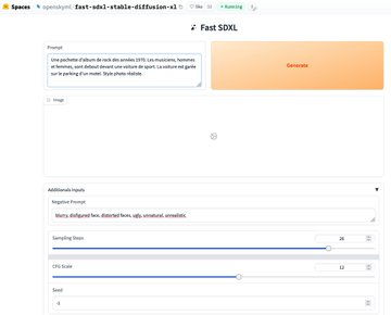 Fast SDXL (https://huggingface.co/spaces/openskyml/fast-sdxl-stable-diffusion-xl…) : outil de génération d’image basé sur Stable Diffusion XL. Génération d’une image en 20s environ avec paramétrage fin (prompt négatif, étapes, CFG… ) Gratuit, sans compte, illimité, open source, partage par url possible.
