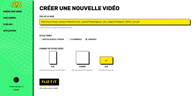 Fliz (http://fliz.ai) génère des vidéos image, voix et sous-titres à partir d’une URL ou d’un texte à la manière d’une bande-annonce ou d’une mise à avant produit. 3 formats, texte éditable, plusieurs voix. 5 crédits gratuits /mois (1 à 2 vidéos)