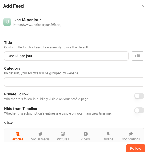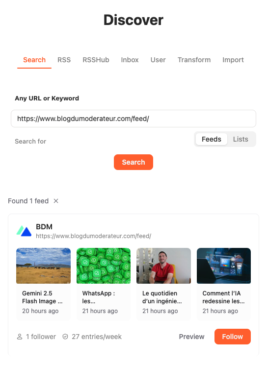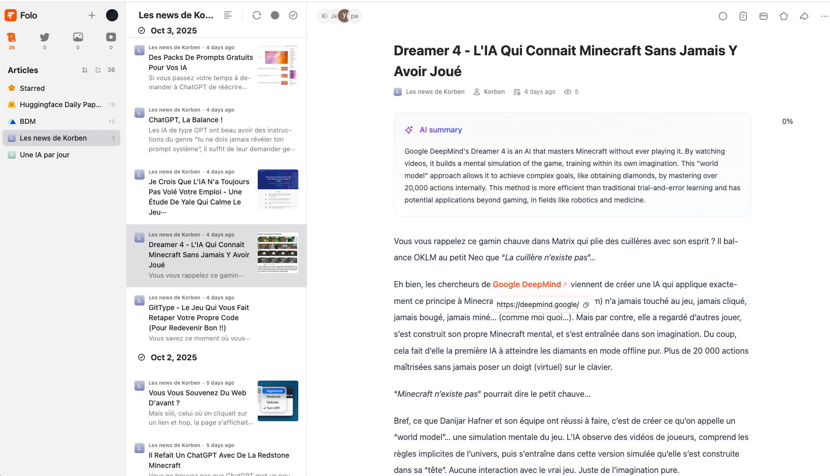 Folo (documentation : https://github.com/RSSNext/Folo et application : folo.is) est un agrégateur de contenus (réseaux sociaux, fils rss) augmenté par des fonctions basées sur l’IA générative : résumé (en anglais), traduction et catégorisation.