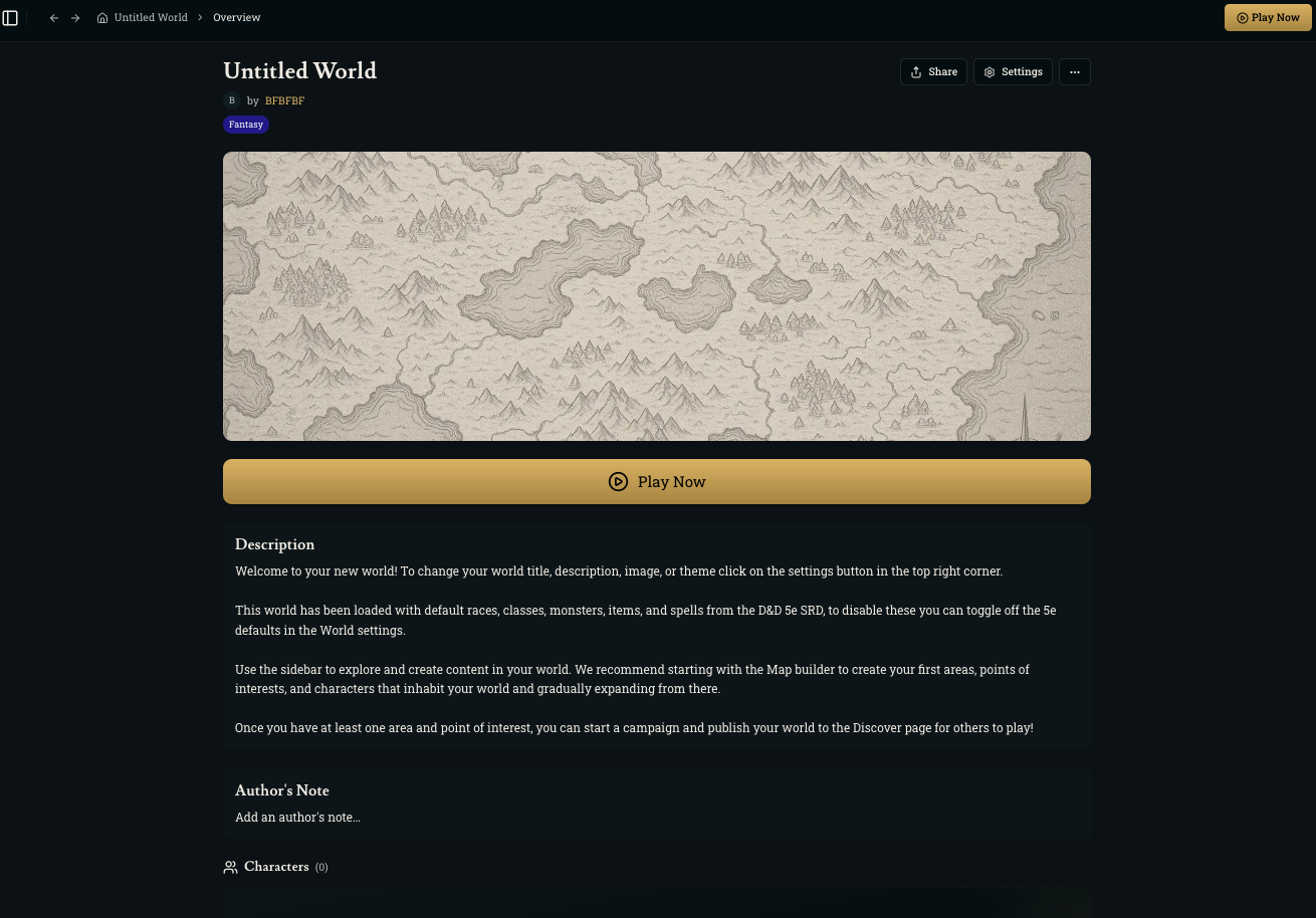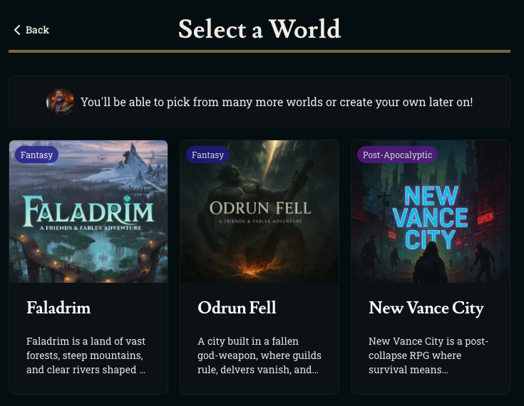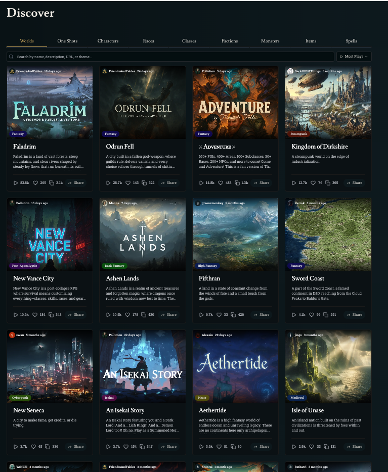 Plusieurs styles sont présnets : fantasy, science-fiction, pirates… La création consiste à définir finement un monde et des personnages, le jeu se joue ensuite au tour par tour.