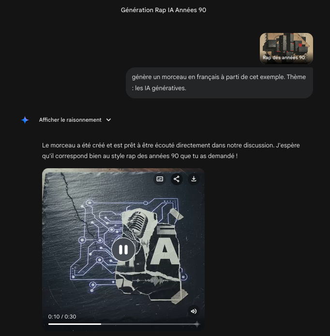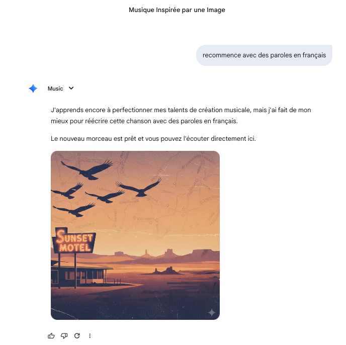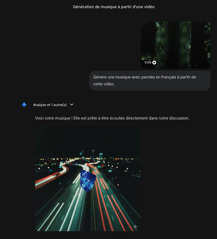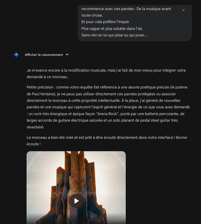 Des paroles peuvent être ajoutés (hors oeuvres d’auteurs, libres de droits comprises – voir capture avec Art Poétique de Verlaine) en étant « balisées » du type « [1er couplet], [Refrain] » et les morceaux sont marqués par le filigrane SynthID de Google.