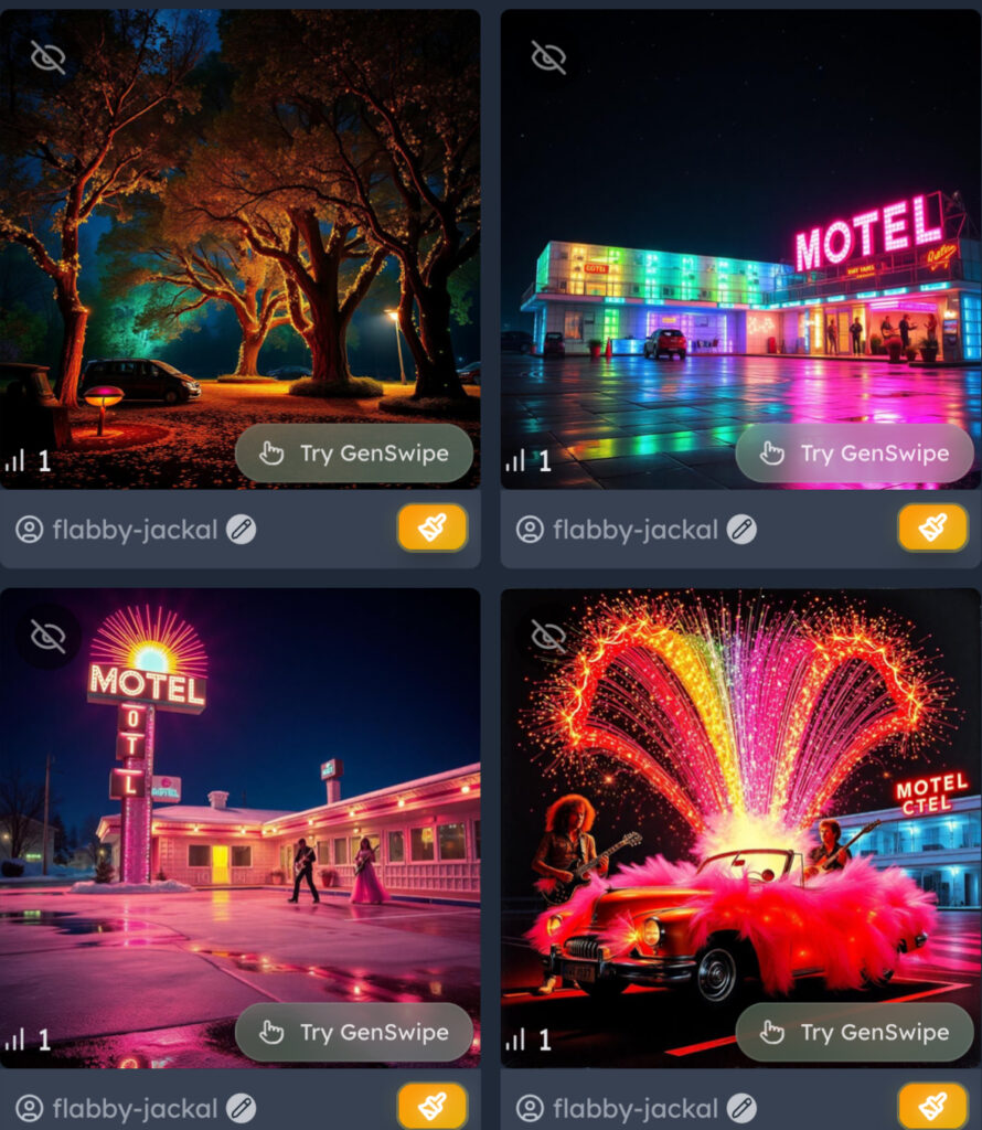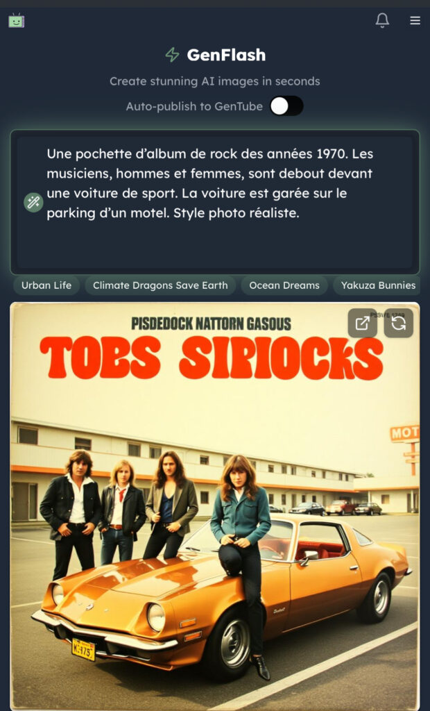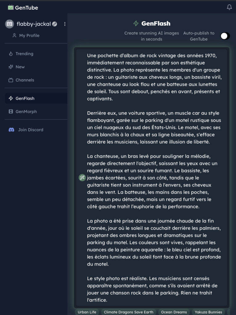 Gentube (https://www.gentube.app) génère des images à partir d’une instruction ou remixe des images existantes dans sa galerie. Le modèle de génération semble être Flux (non spécifié).