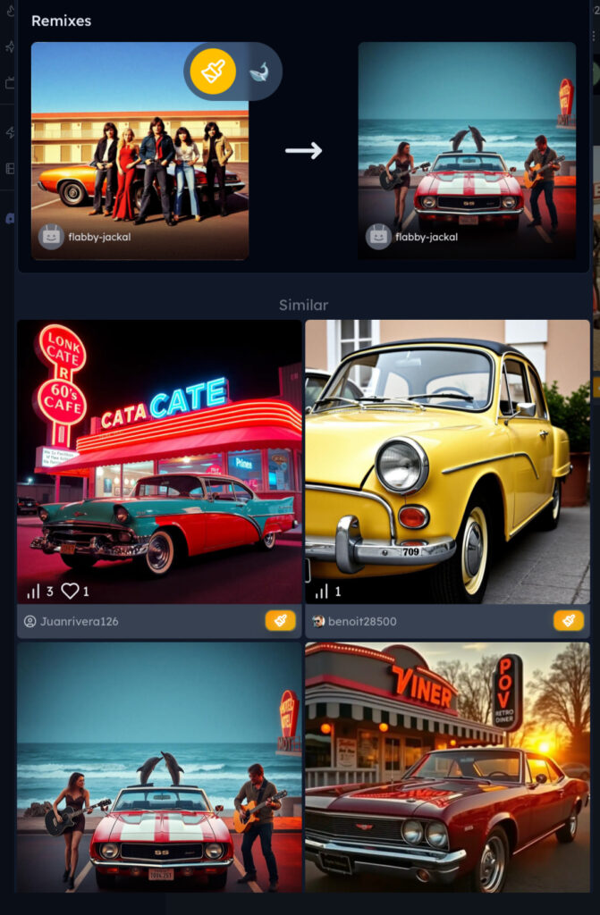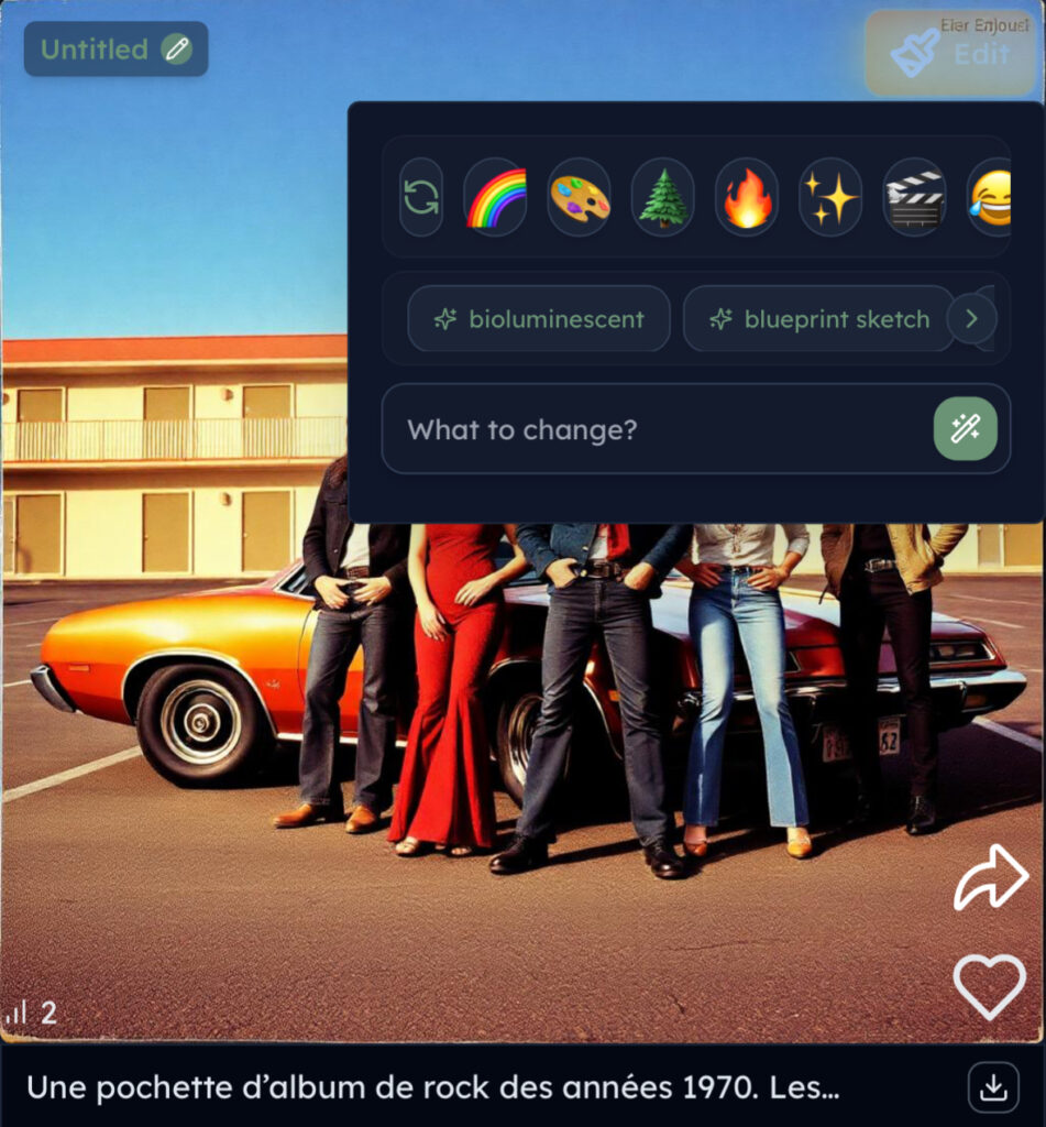 Fonctions sociales avec profil et likes : les images générées sont par défaut publiques, si elles ne le sont pas, elles ne sont pas sauvegardées. Amélioration de prompts proposée.