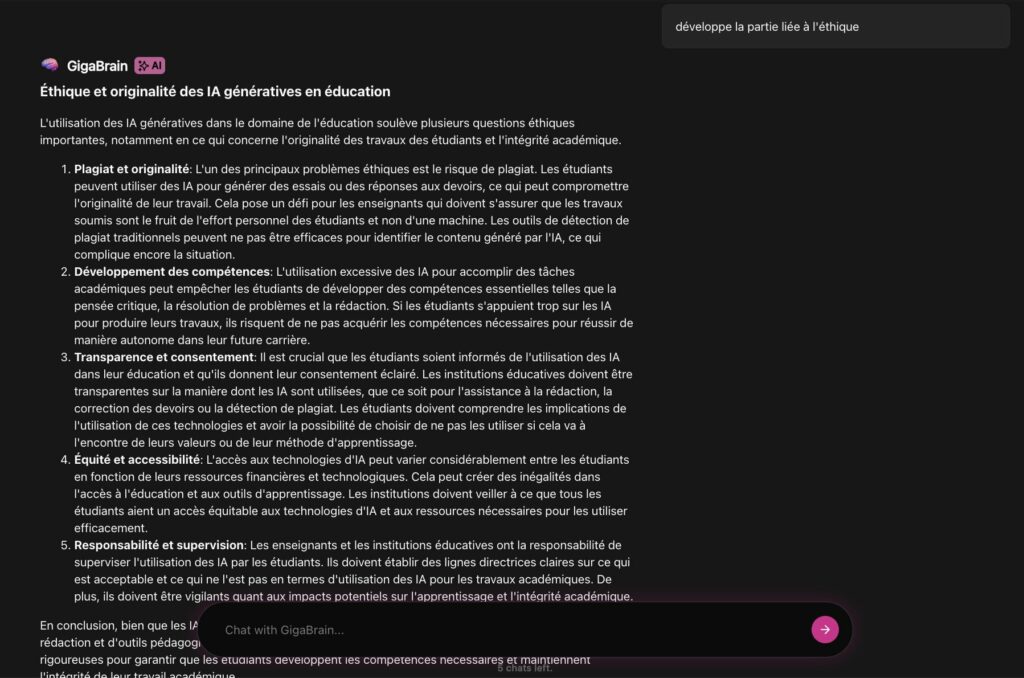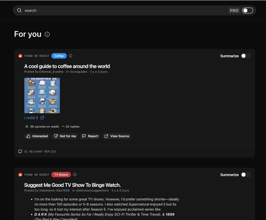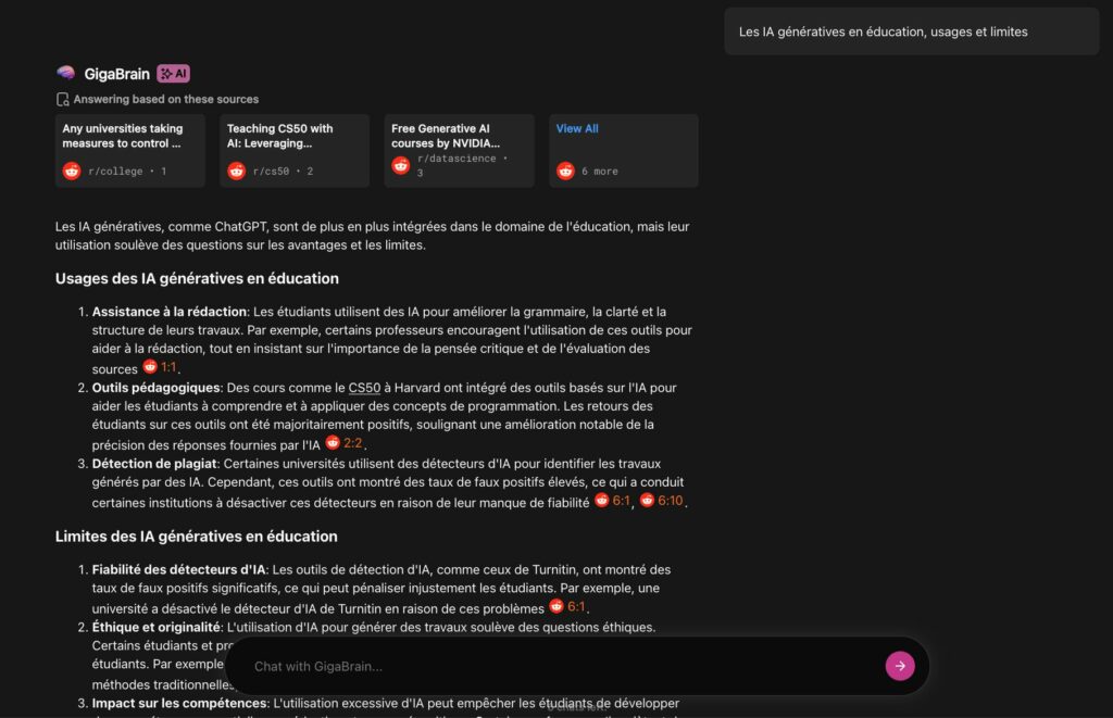 Gigabrain (https://thegigabrain.com) est un moteur de recherche couplé à une IA générative centré sur Reddit. Synthèse des résultats et sources citées sont disponibles sans compte, chatbot et outil de veille par sujets clés accessibles avec compte. Partage par url.