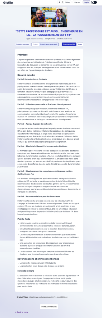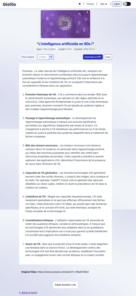 Deux modes proposés : les 7 points saillants et résumé détaillé.