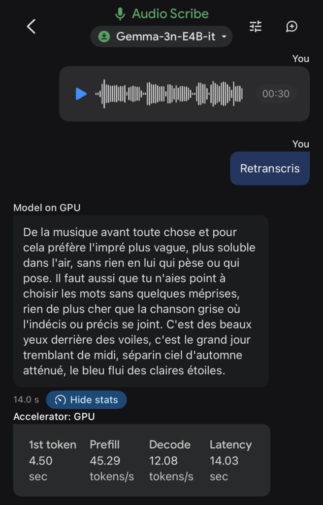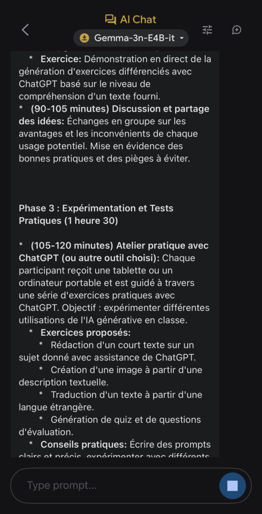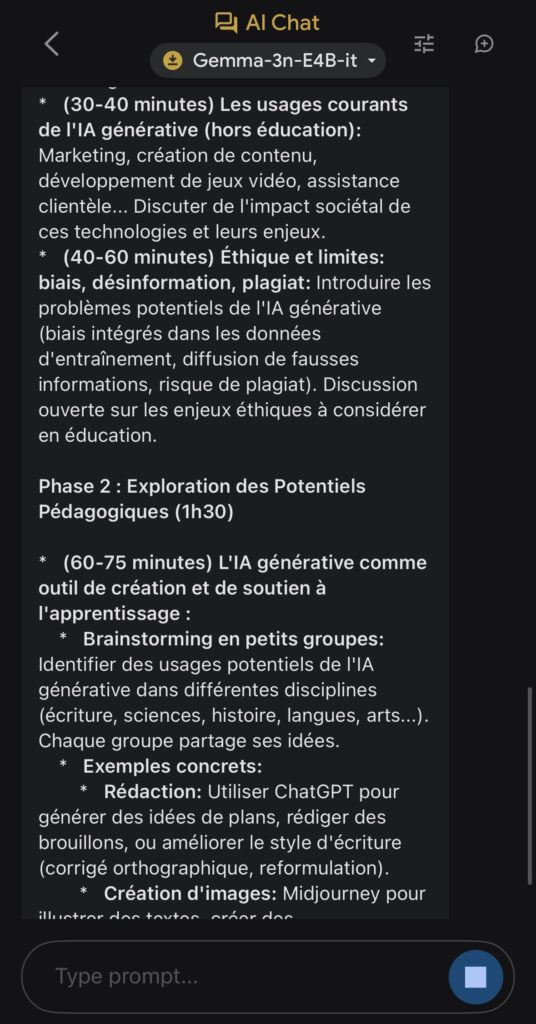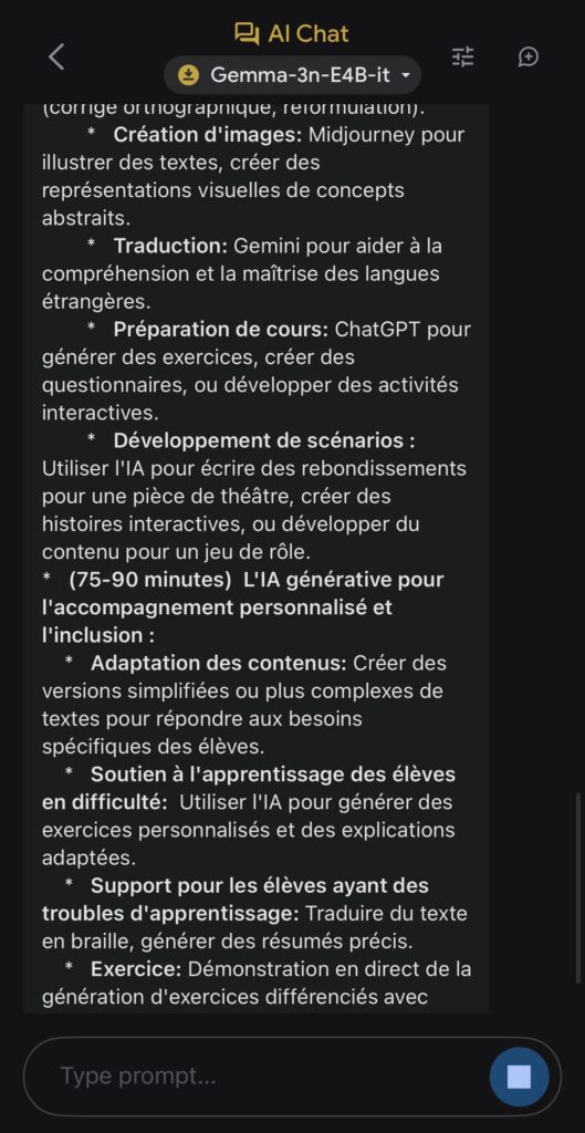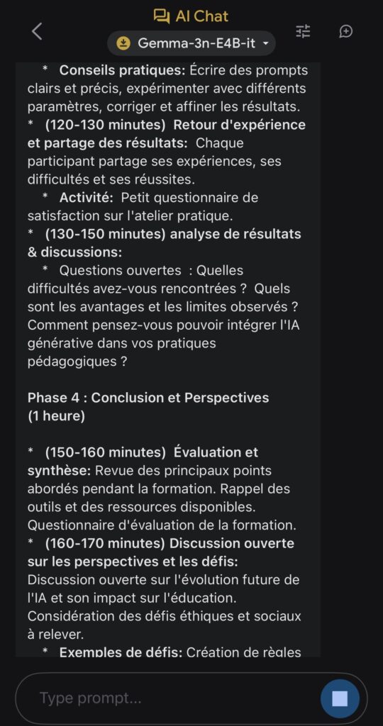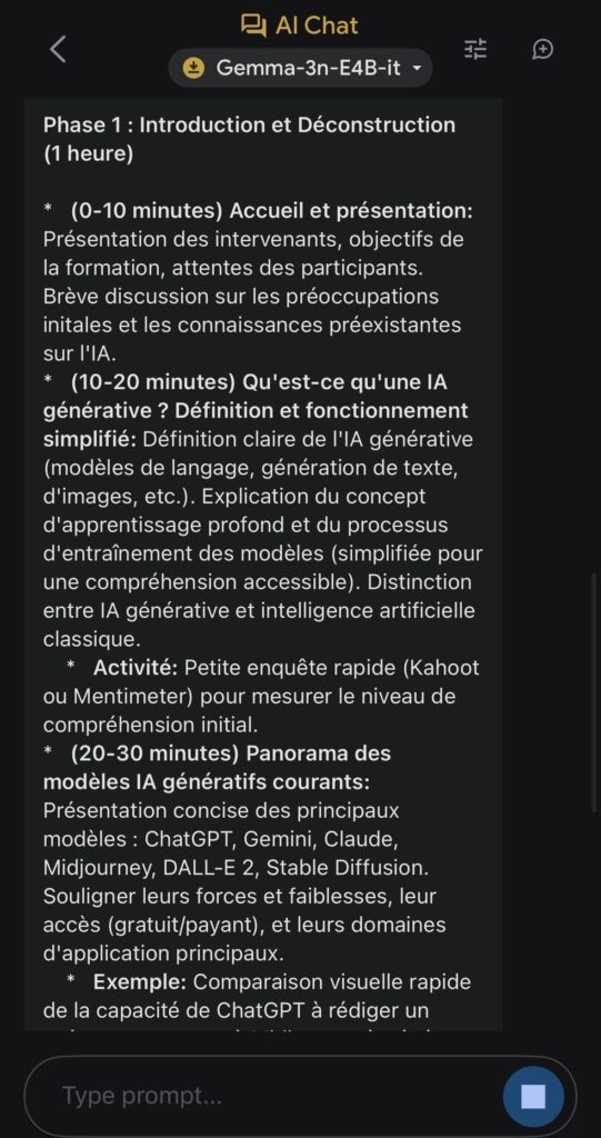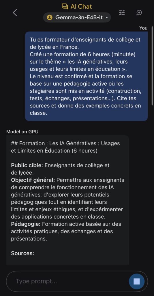 Après avoir chargé le modèle choisi parmi Gemma-3n-E2B-it (3,39 Go), Gemma-3n-E4B-it (4,65 Go)ou Gemma-3n-1B-it (565 Mo) via un compte Hugging Face, ils s’exécutent localement et hors ligne directement sur l’appareil.