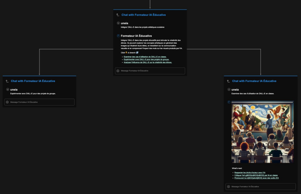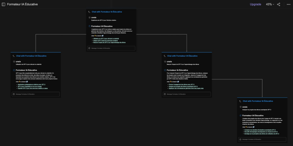 GPTS2D (https://gpts2d.com) crée des agents spécialisés capables de répondre à plusieurs sujets sur le même espace sous forme d’une carte mentale « infinie ». Chaque branche apporte de nouvelles propositions et devient un chatbot indépendant.