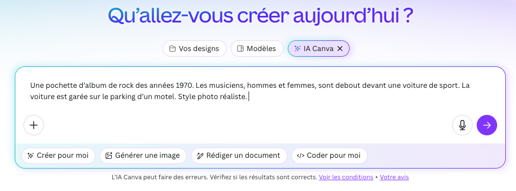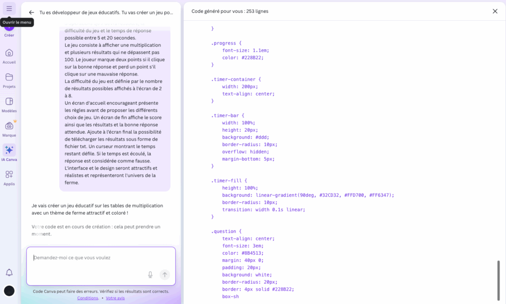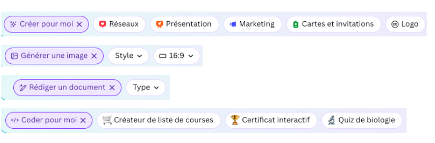 L’IA de Canva (https://www.canva.com/) est un chatbot qui propose de guider la génération des contenus proposés dans Canva, comme un « assistant » de création : images, textes, présentations et applications.