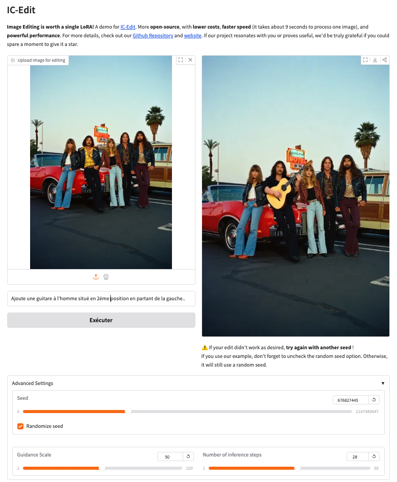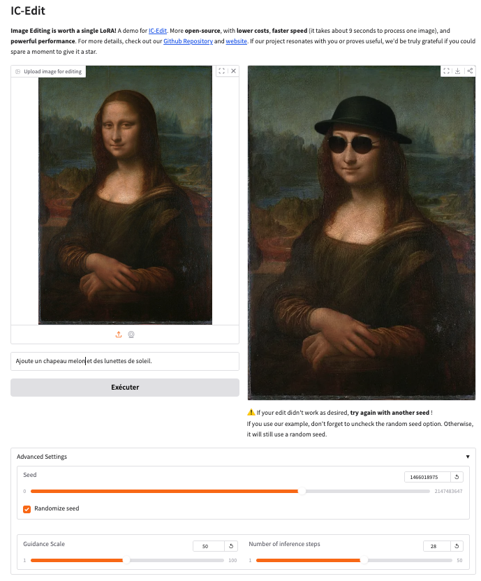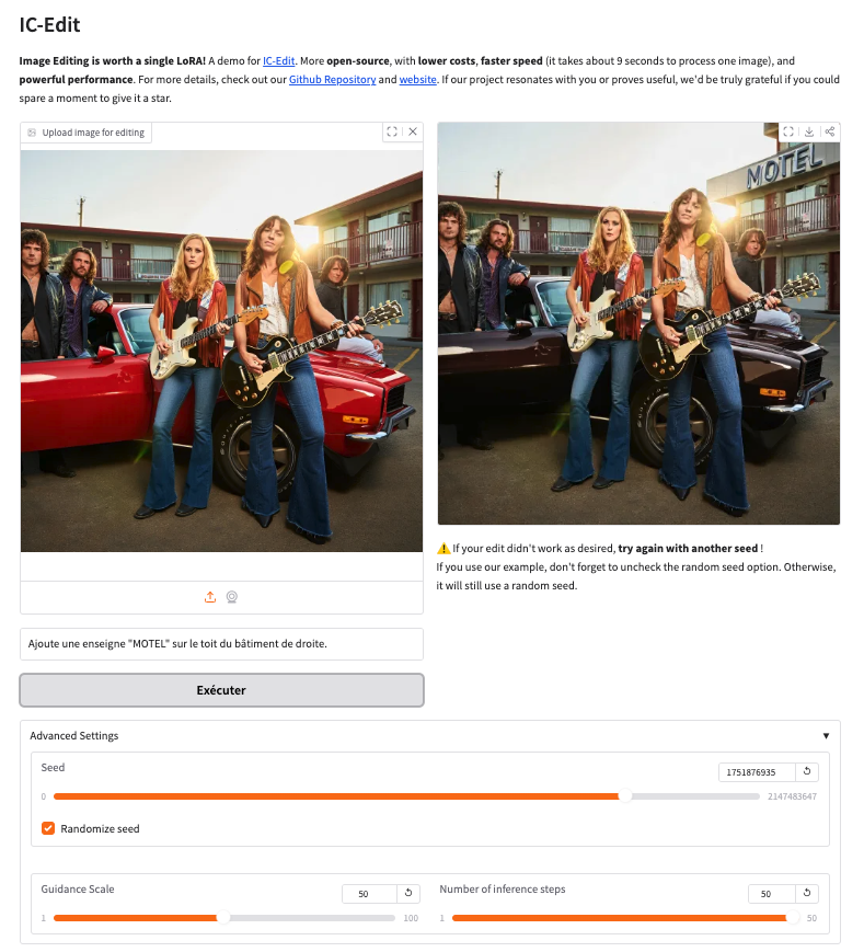 IC-Edit (documentation : https://river-zhang.github.io/ICEdit-gh-pages et démonstration : https://huggingface.co/spaces/RiverZ/ICEdit) génère des modifications dans une image à partir d’une instruction, tout en restant fidèle à l’image d’origine.