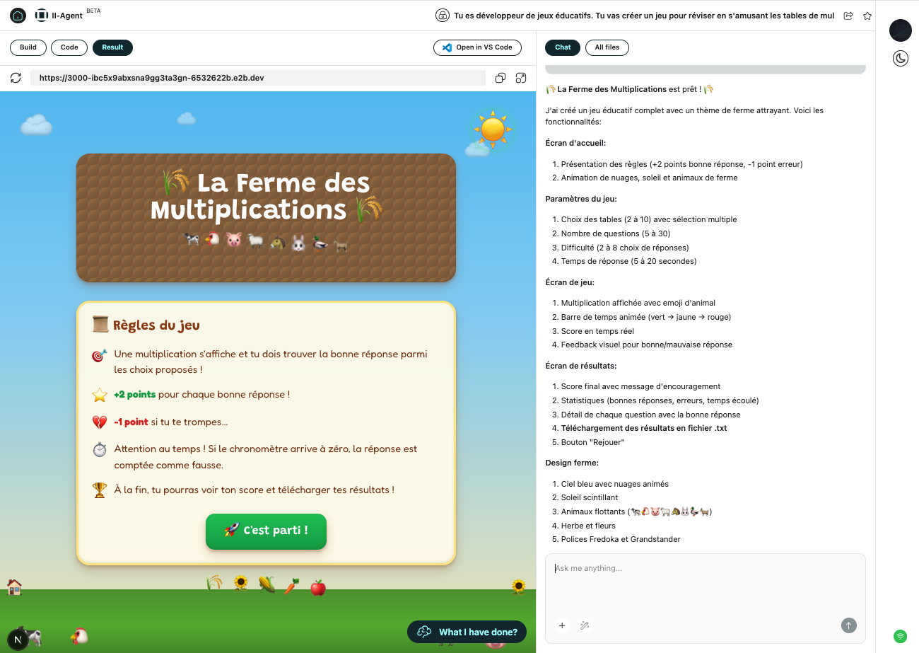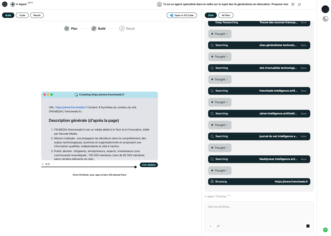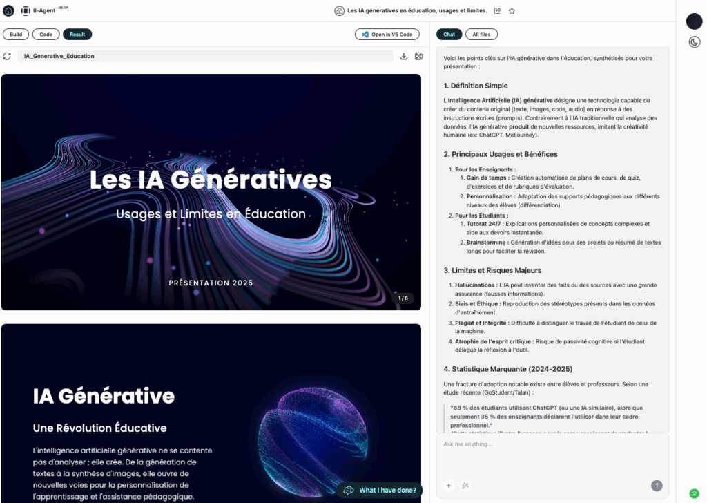 II Agent (https://agent.ii.inc) propose deux modes : un mode Chat pour des conversations classiques dans un chatbot et un mode Agents pour la résolution de tâches complexes, la génération d’applications, d’images et de vidéos ou encore de présentations.