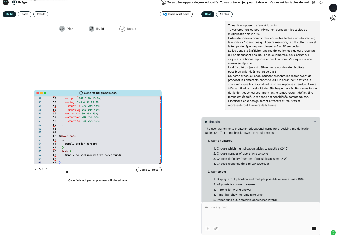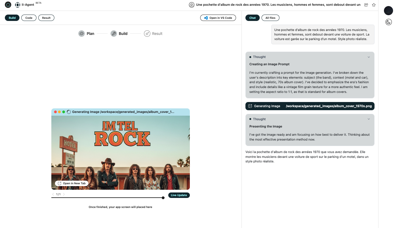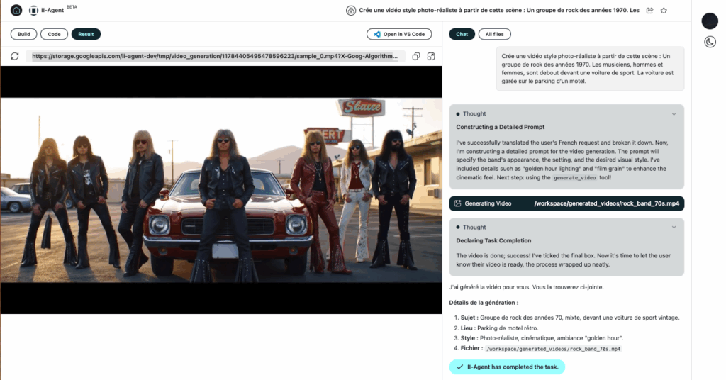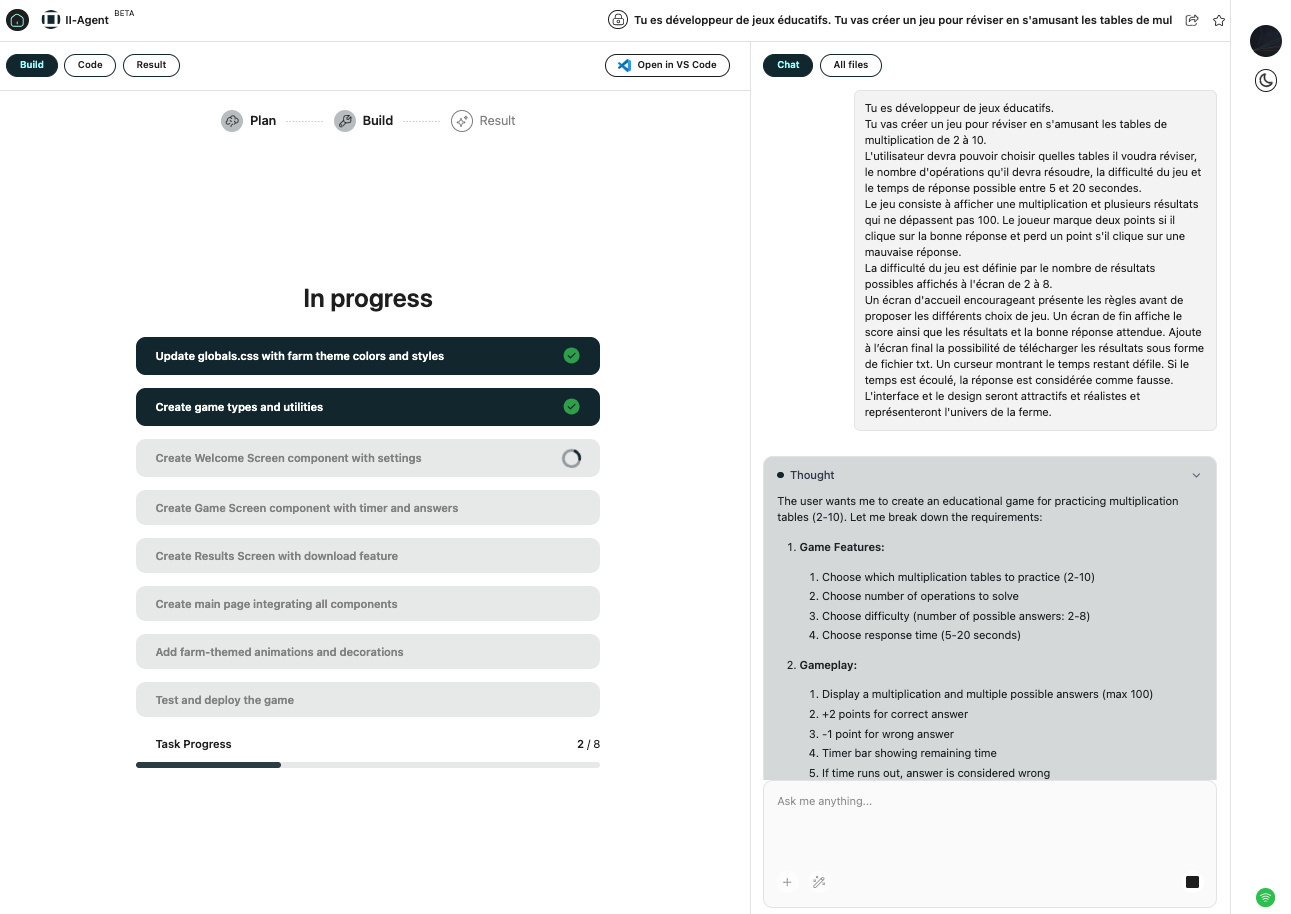 II Agent (https://agent.ii.inc) propose deux modes : un mode Chat pour des conversations classiques dans un chatbot et un mode Agents pour la résolution de tâches complexes, la génération d’applications, d’images et de vidéos ou encore de présentations.