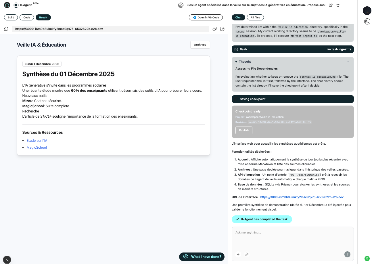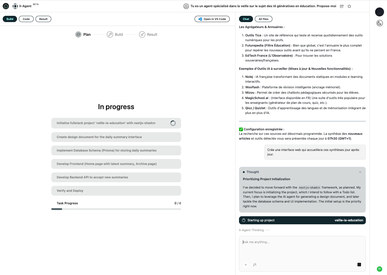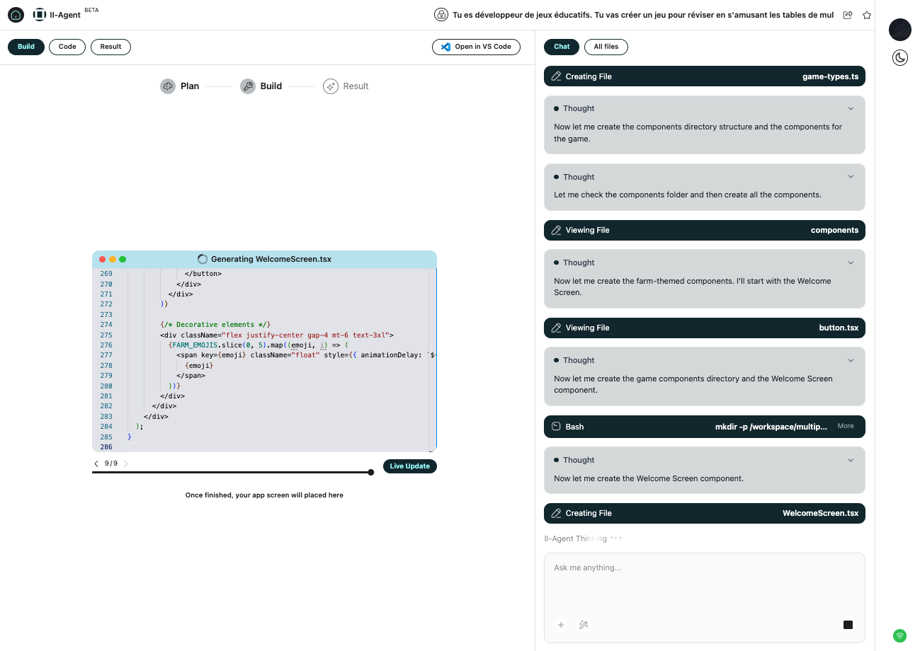 L’interface Agents est autonome si aucune instruction ne vient l’arrêter : un plan d’action est générée puis les agents déployés. L’application est vérifiée en temps réel avant proposition de la génération finale.